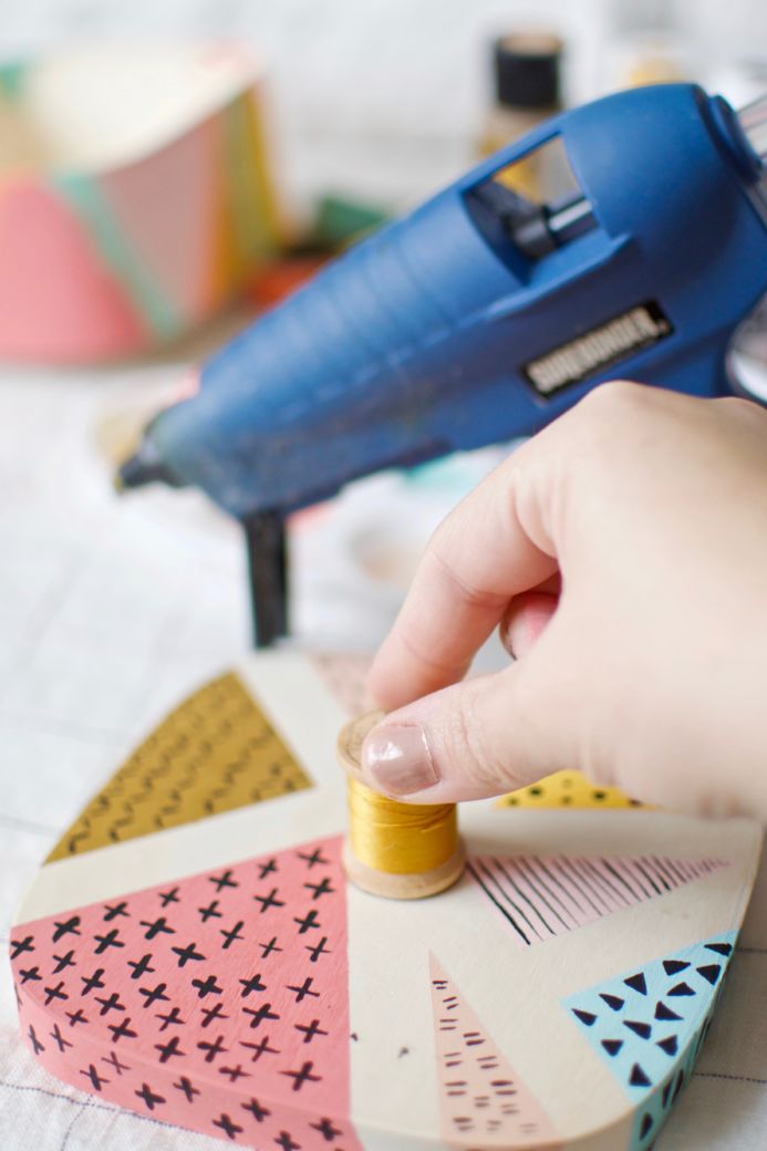 5. Now it’s time to add your knob. I used enough hot glue to cover the bottom of my spool and eye-balled it onto the center of my box top. Push down firmly for a few seconds to give it a good hold.Â