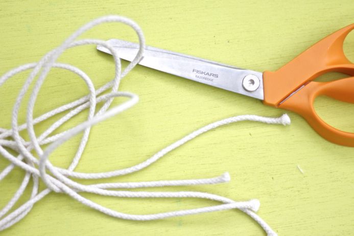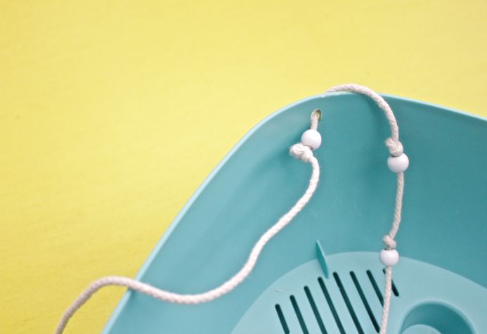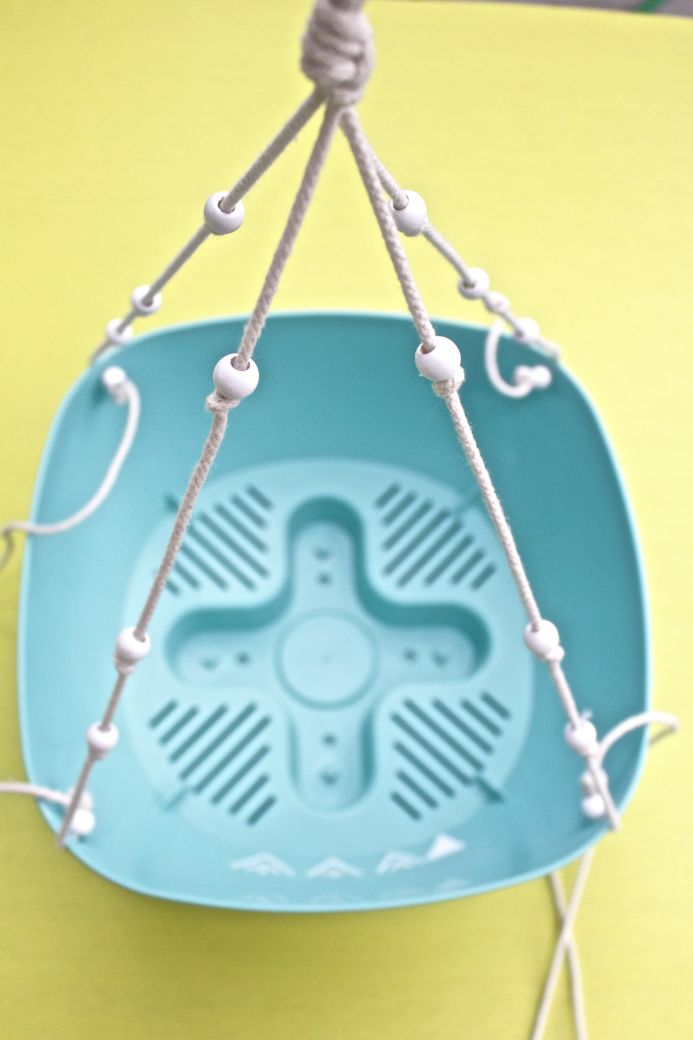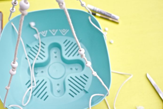 7. Thread one of the pieces hanging from the center through the hole on one corner of the planter then thread a bead through the rope and tie a few knots at the end to hold it in place. Then cut the end of the rope.