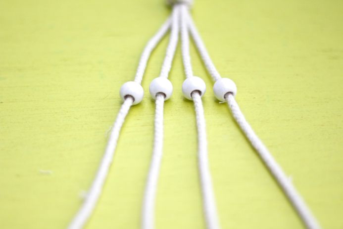 5. Thread a wooden bead on one of the strands hanging down from the last knot and then tie a knot under the bead so that it doesn’t slip down.
