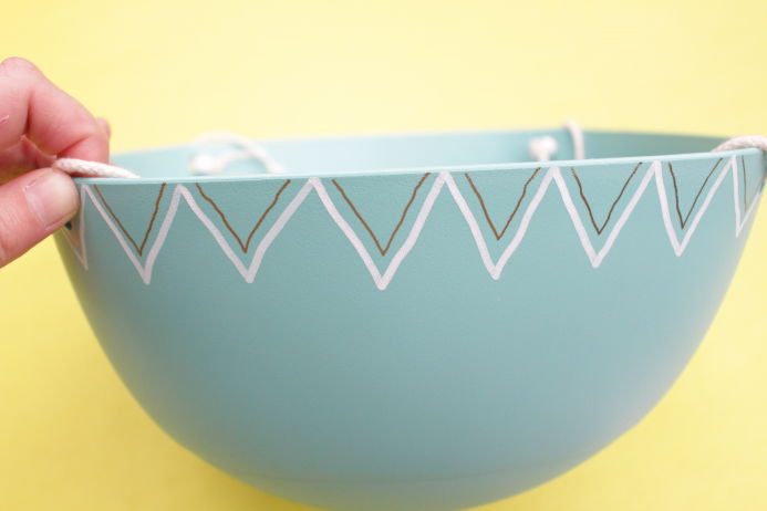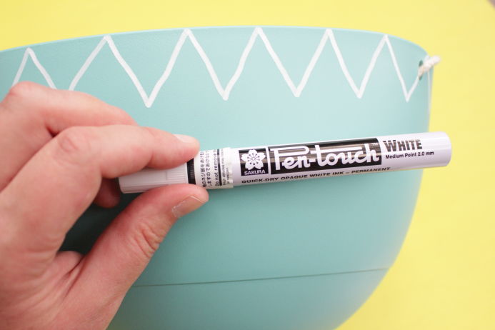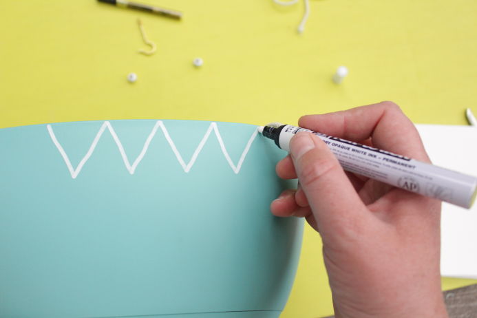 9. Using your paint pen draw a design around the edge of your planter. I choose triangles but feel free to do any design you’d like.