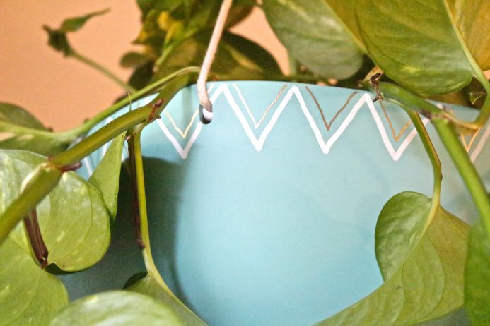 One of my favorite shows when I was young was Three’s Company. I was so obsessed with the show that I actually made up a dance routine that I choreographed to the theme song then ended with a handstand against our front door. Not only did I love the goofy capers Jack, Janet and Chrissy got into that always were mysteriously worked out when the credits rolled but I loved the styling on the show. From Chrissy’s knee-high socks to Janet’s leather boots to Jack’s velour sweat suits to the way their apartment was decorated I wanted to have an apartment just like theirs complete with the wicker, rattan, yellow and orange tones and, of course, tons of plants and macramé. This week’s DIY project pays homage to my childhood Three’s Company addiction and was inspired by a hanging planter that I found on sale that I couldn’t pass up. Most home stores carry hanging planters but I found mine in the garden section at Target. I added a modern touch with some geometric designs done with Sakura Pen-touch paint pens which were awesome for this project since they’re waterproof and permanent.