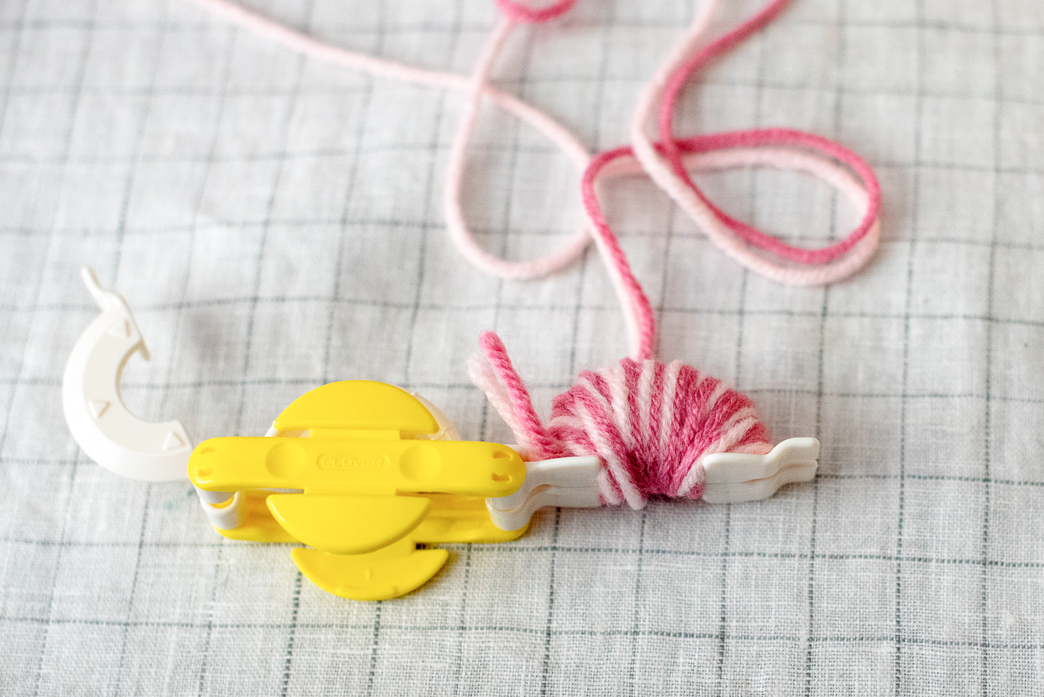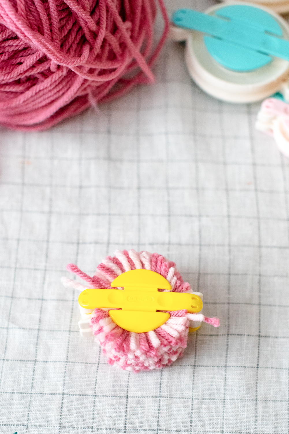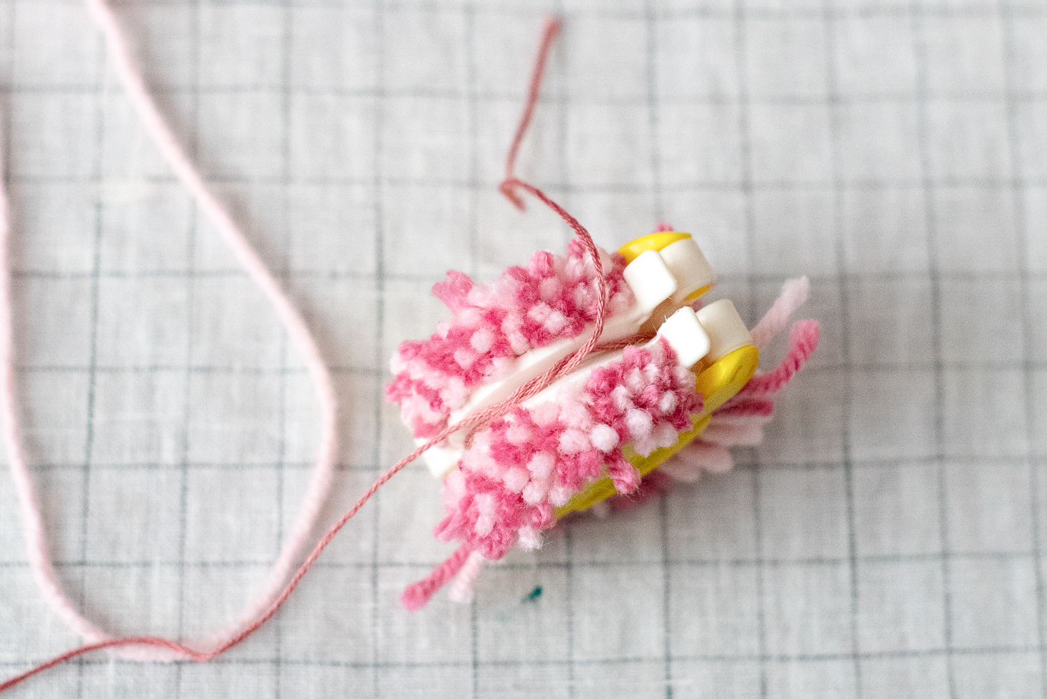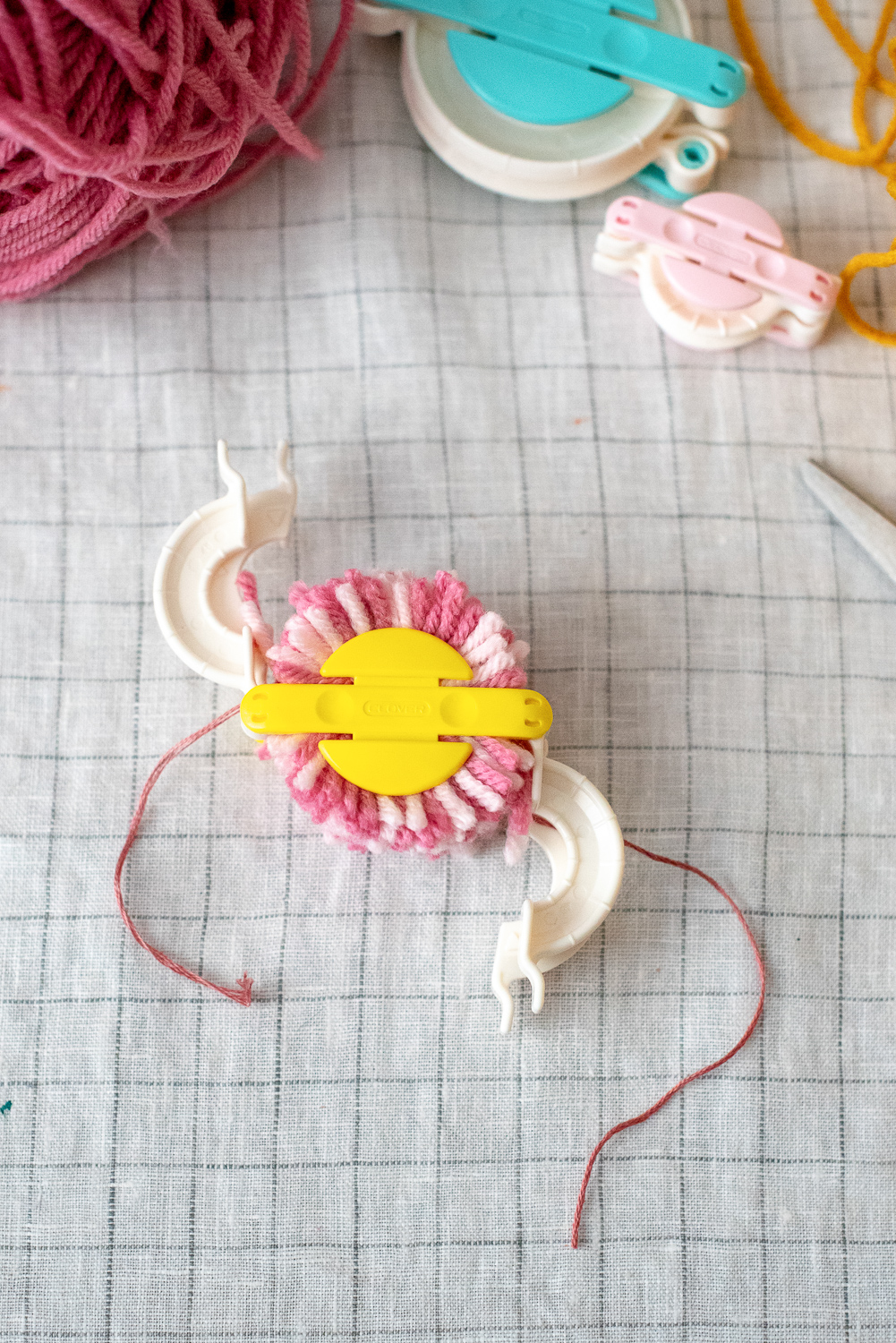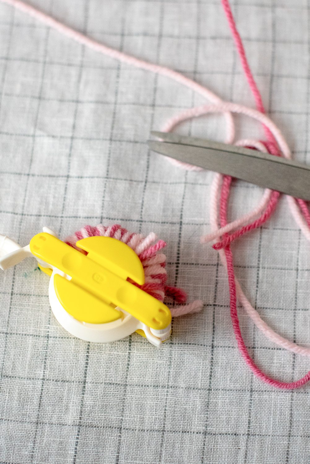 1. Open one of the sides of the pom pom maker. To make a multicolored pom pom like the ones I did, choose 2-3 colors of yarn you’d like. Line the strands up and start wrapping them evenly around the arms of the pom pom maker. To make a nice full fluffy pom pom, it’s best to wrap the yarn until it’s almost flush with the bottom of the arms. Once that’s done, cut the ends, close those arms and do the same on the other side.