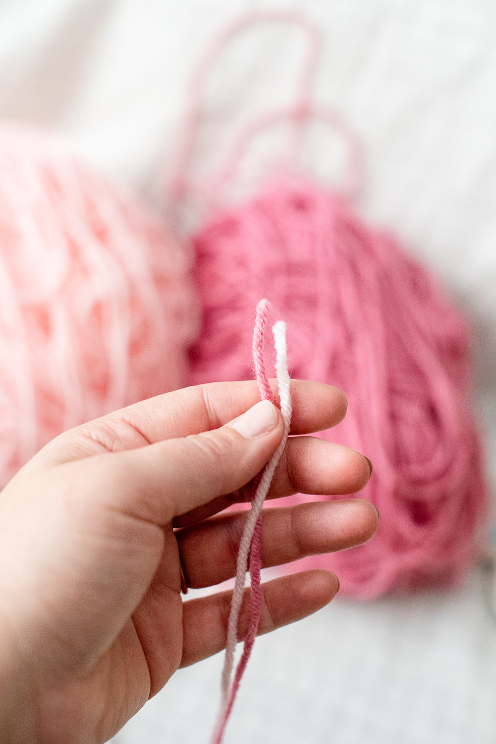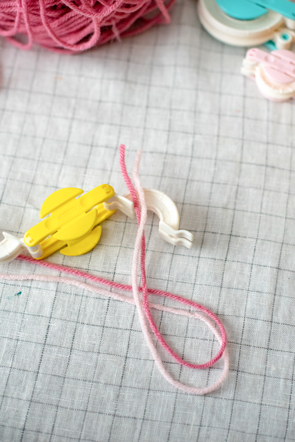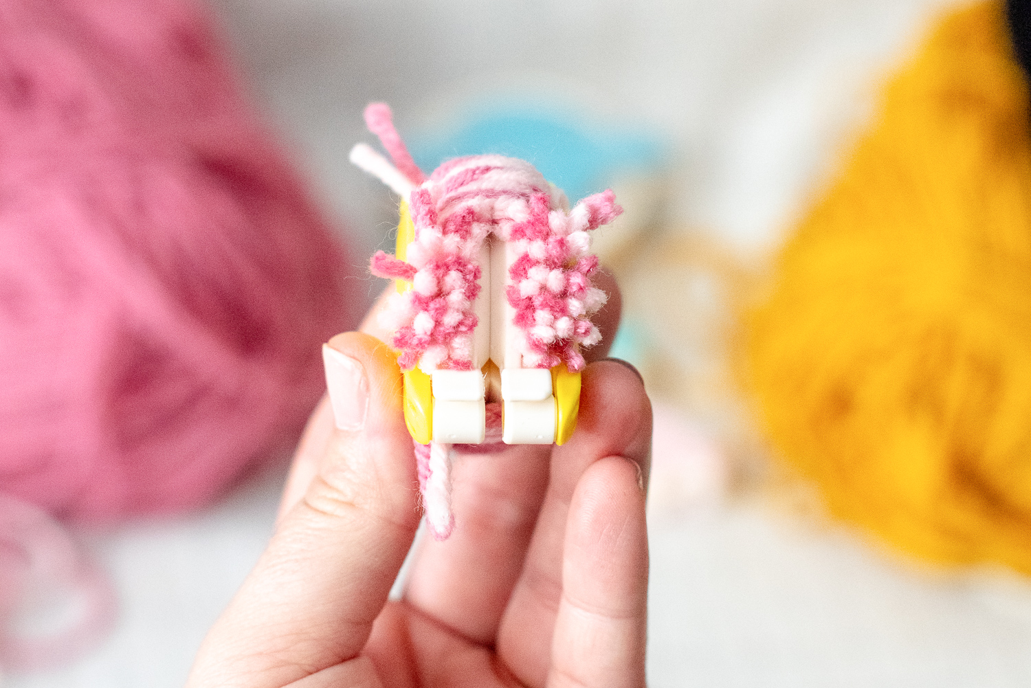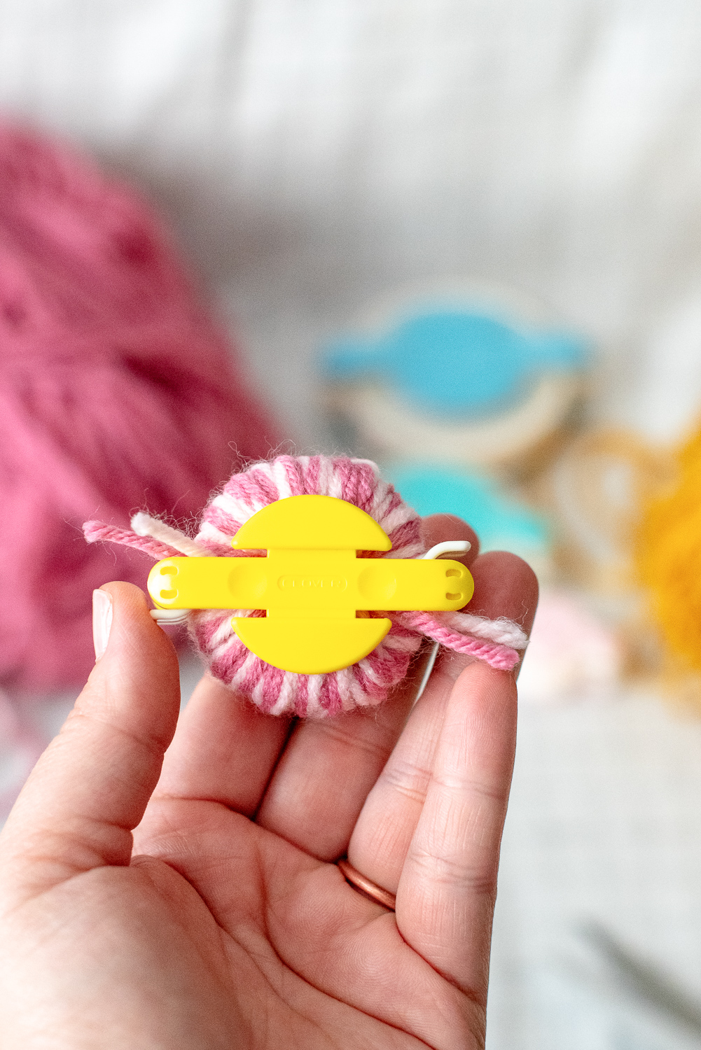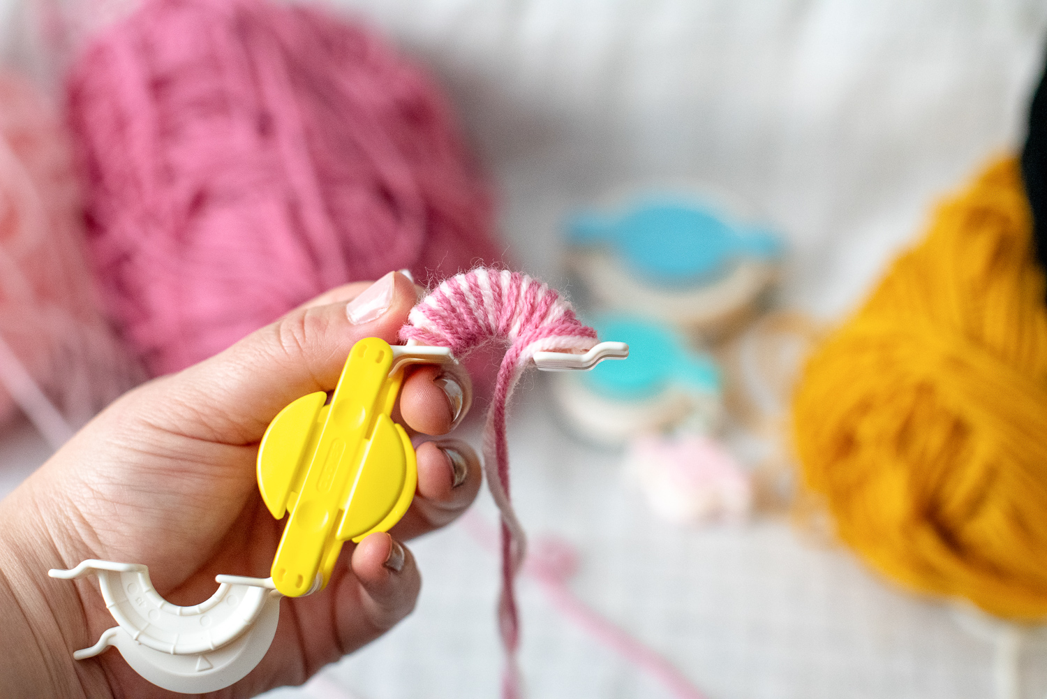 1. Open one of the sides of the pom pom maker. To make a multicolored pom pom like the ones I did, choose 2-3 colors of yarn you’d like. Line the strands up and start wrapping them evenly around the arms of the pom pom maker. To make a nice full fluffy pom pom, it’s best to wrap the yarn until it’s almost flush with the bottom of the arms. Once that’s done, cut the ends, close those arms and do the same on the other side.
