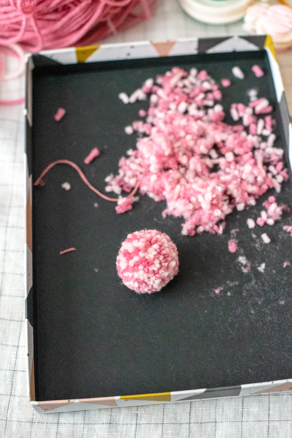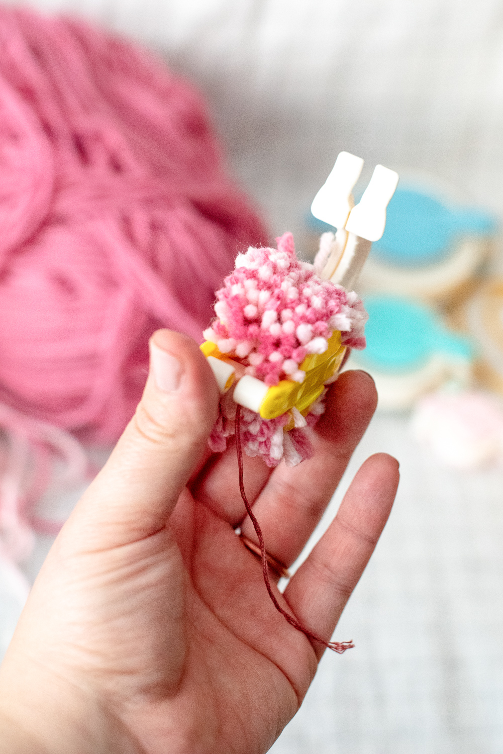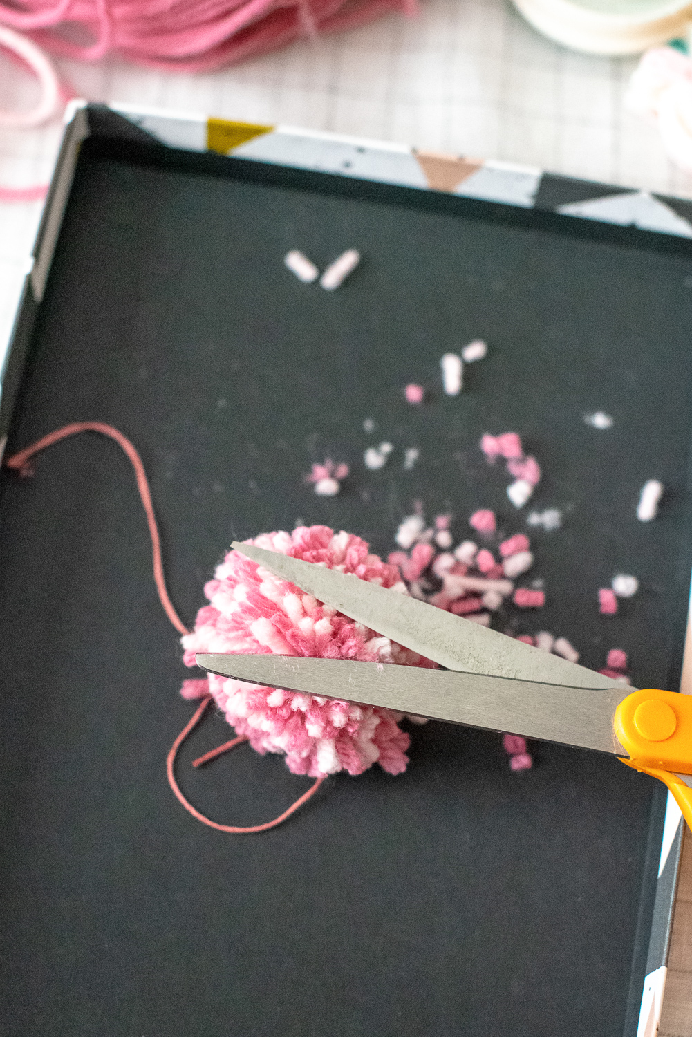 2. Cut the yarn open down the arms on each side, hold the maker securely so it doesn’t come apart during this. Using about a 6 inch piece of embroidery floss around the center, tie it tightly and make a knot or two (this is what will keep all the yarn together and complete the pom pom). Open one arm at a time on each side & then pull the pieces apart in the middle to free the pom pom. Trim the pom pom to your liking with a sharp pair of scissors, I like doing this over a tray of some sort for easy cleanup. 🙂