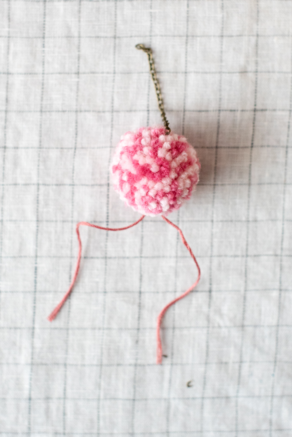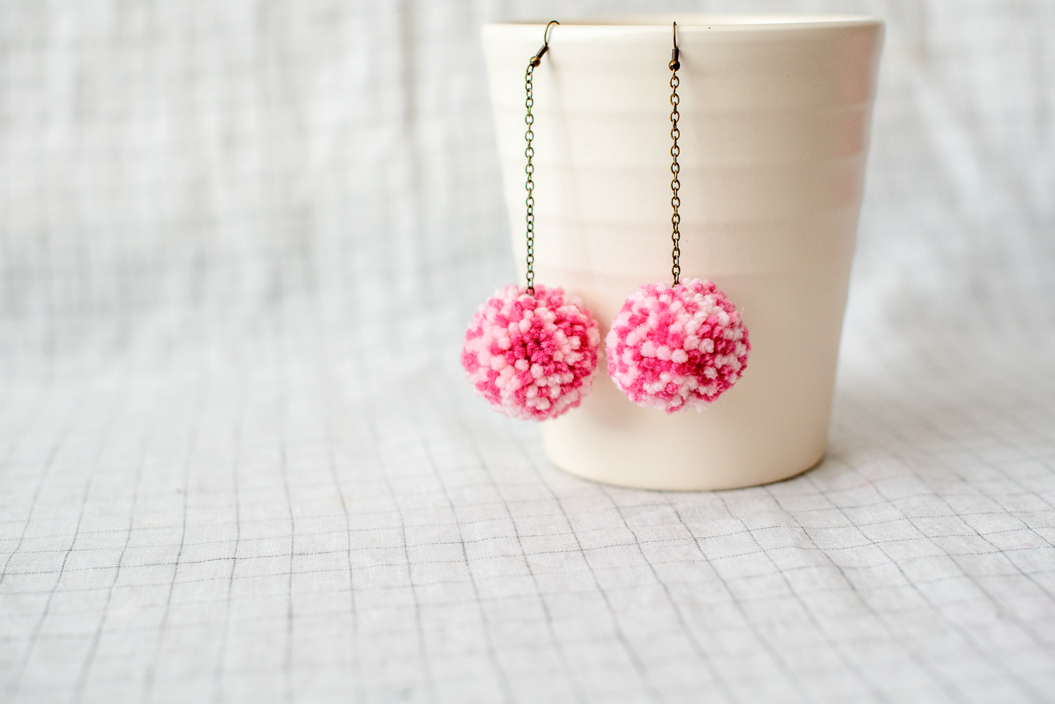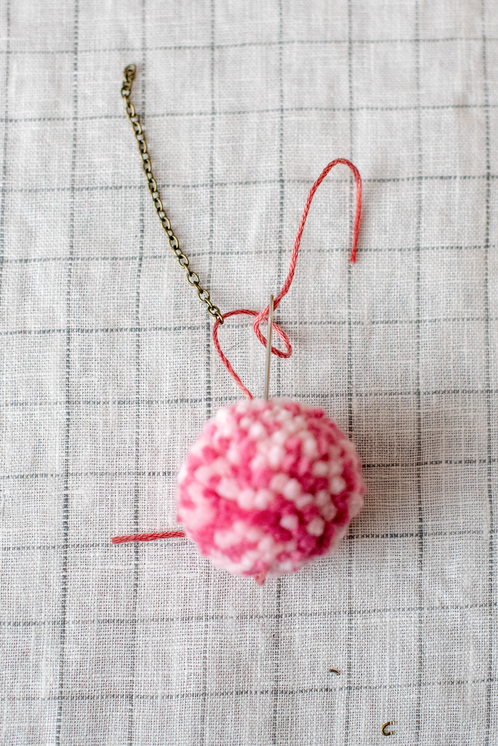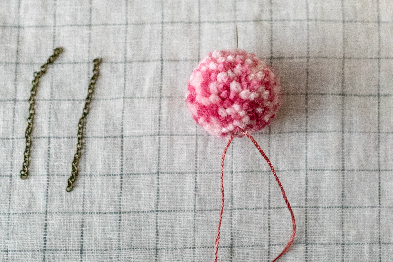 To secure the pom poms to the chain, take another 6 inch piece of embroidery floss and thread it through a needle. Pierce the needle through one end of the pom pom leaving one end of the floss out at the bottom. Thread it through one end of your chain and then back down close to where you came up, and back out through the bottom of the pom pom. Tie the two pieces of floss at the bottom securely in a knot and trim. Hold the chain/pom pom up to your ear to make sure it’s the right length and then attach it to an ear wire at the top of the chain. And you’re done!