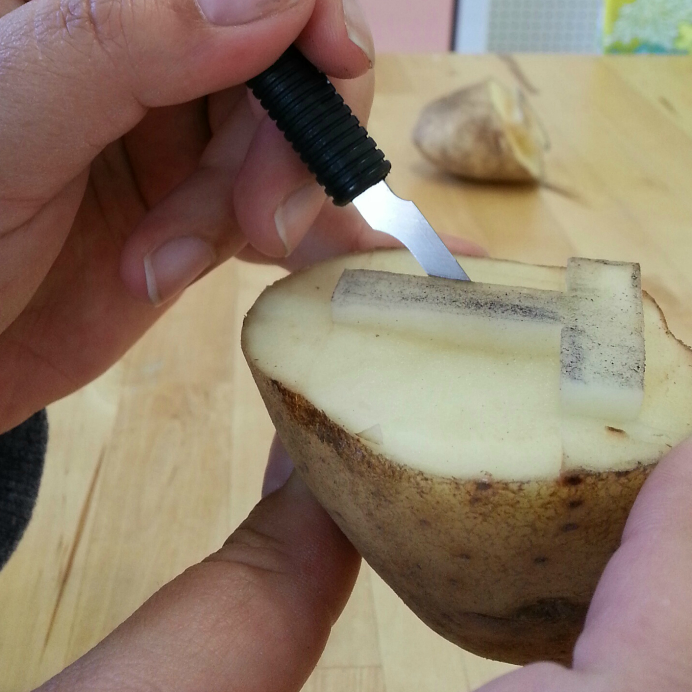 3. Use your craft knife to carve away the negative space of your design. This will be the area of the potato that falls outside of your drawn design.