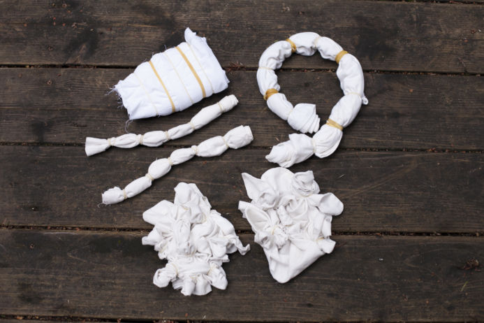 While your dye is becoming beautiful you can prepare your fabric. Make sure to use pre-washed, natural fabrics as those adhere the color the best. Use the rubber bands, popsicle sticks, and little wood boards to tie, wrap, fold, and twist your fabrics. Wherever the fabric is bound will leave a white mark. You cannot do this part wrong – any method seems to look good with indigo.