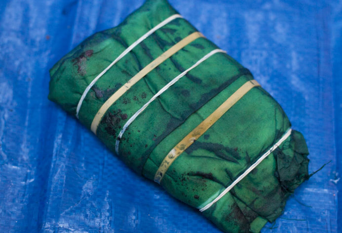 Before dipping your fabric you have to pre-wet it. You can do this by dipping it into another bucket with clean water or just hosing it down. Squeeze out any excess water. By now you may realize that everything has to be done slowly. So, very slowly dip your pre-wet fabrics into the dye and let them go only after they are fully submerged. You want the water to be as still as possible to keep the oxygen out.