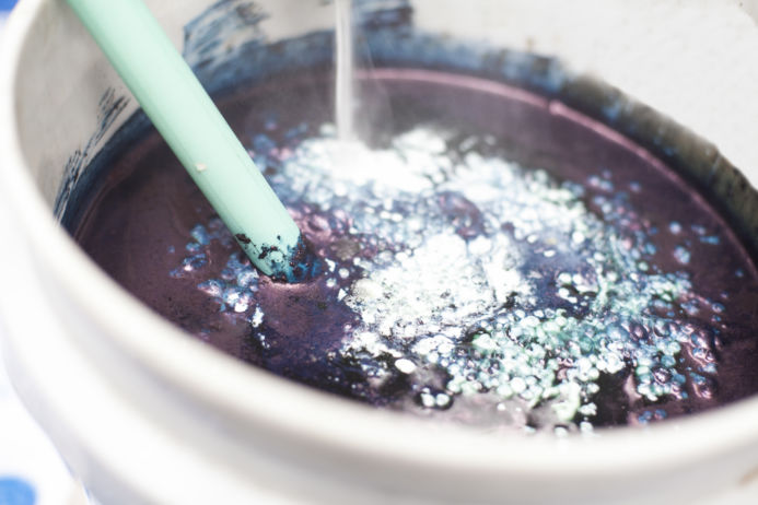 Take the lid off the bucket and you should see some foam on the surface – these are called blooms. Pro-dyers can cultivate some huge blooms, but we didn’t have much going on in our vat this time. The dye seemed to work all the same.