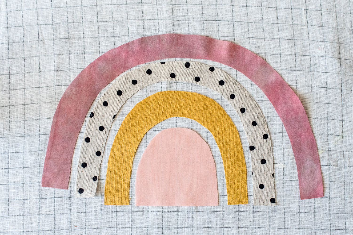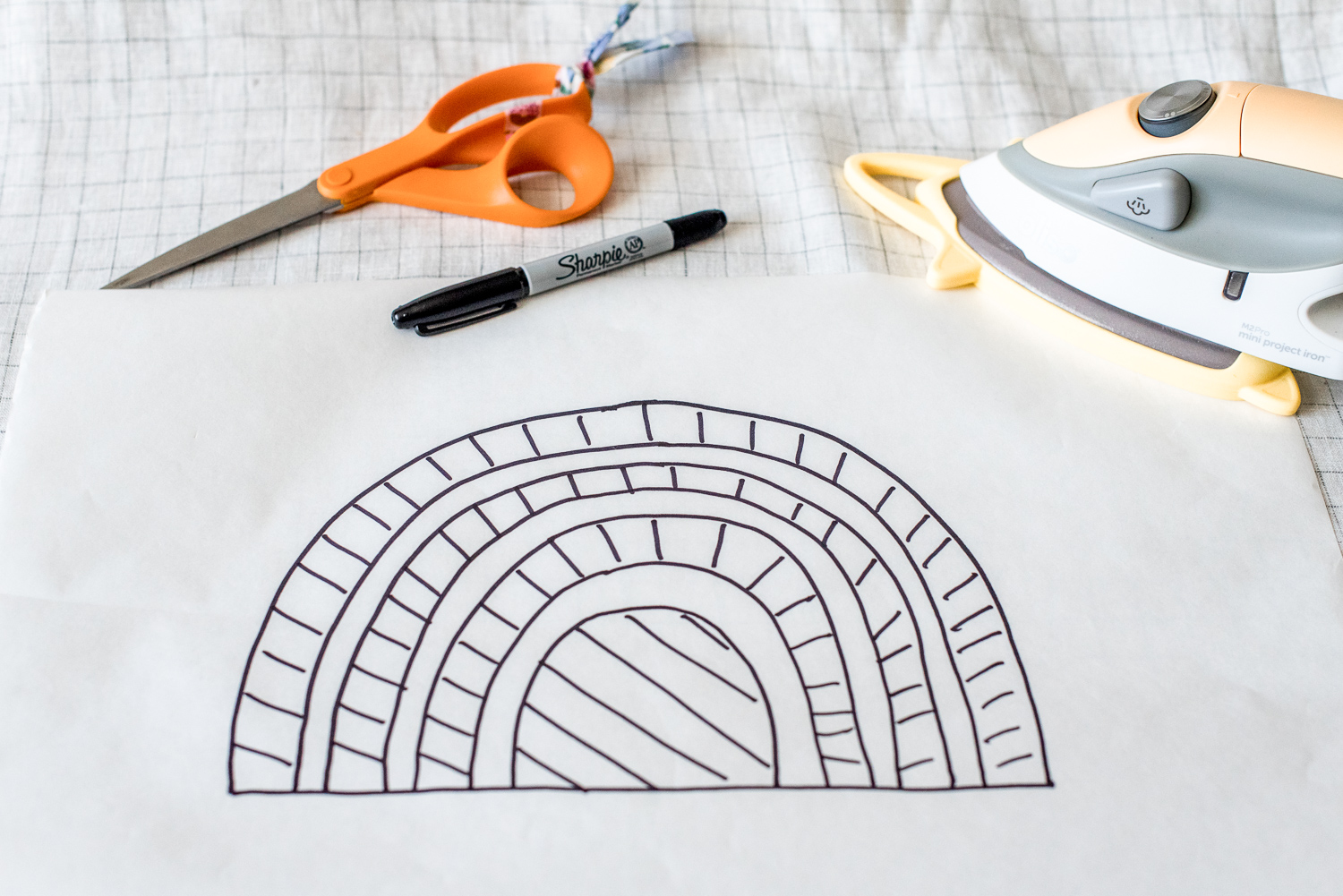 1. Decide what shape or design you want your appliqué to be and draw it onto the parchment side of your freezer paper. I chose a simple rainbow design and freehanded the whole thing because I wanted it to have an imperfect look. Then cut out your pattern.