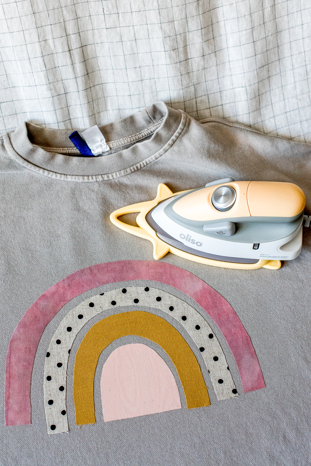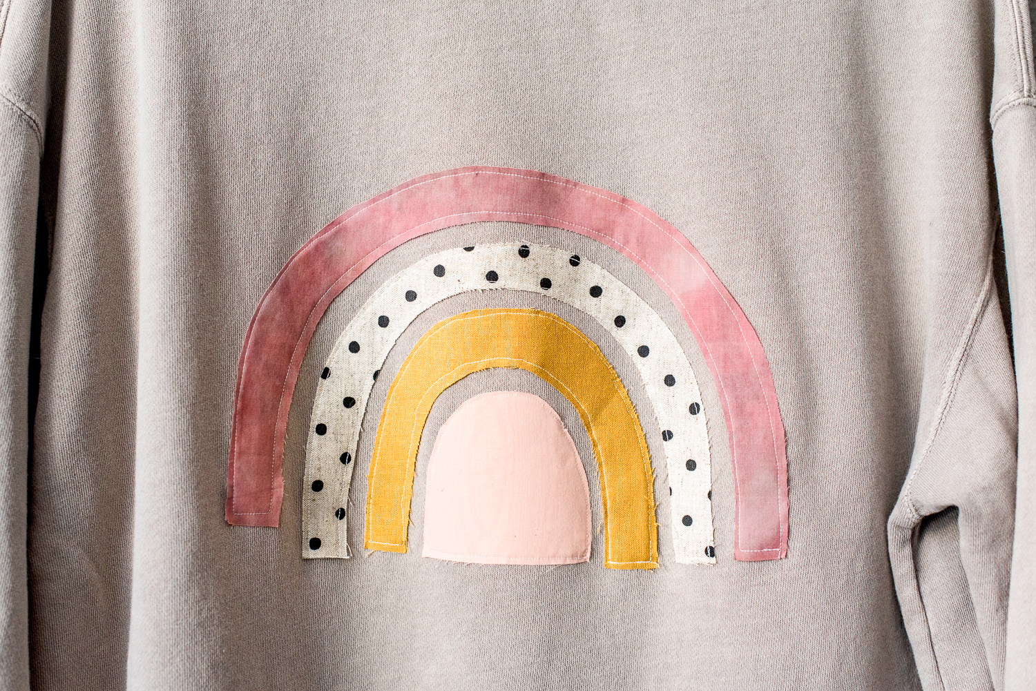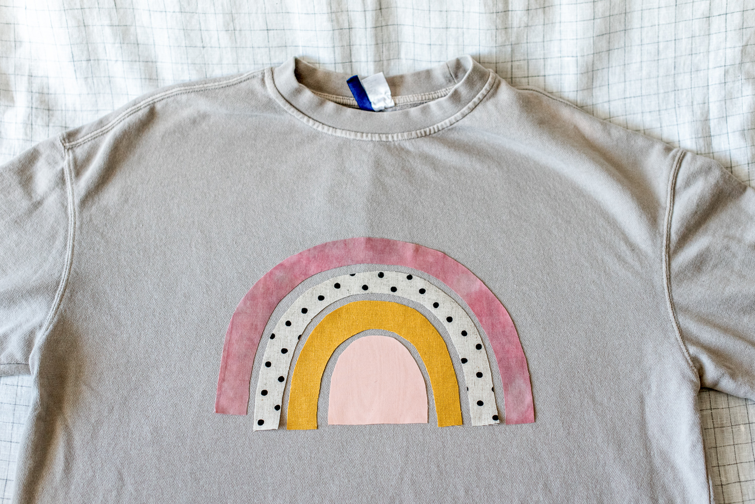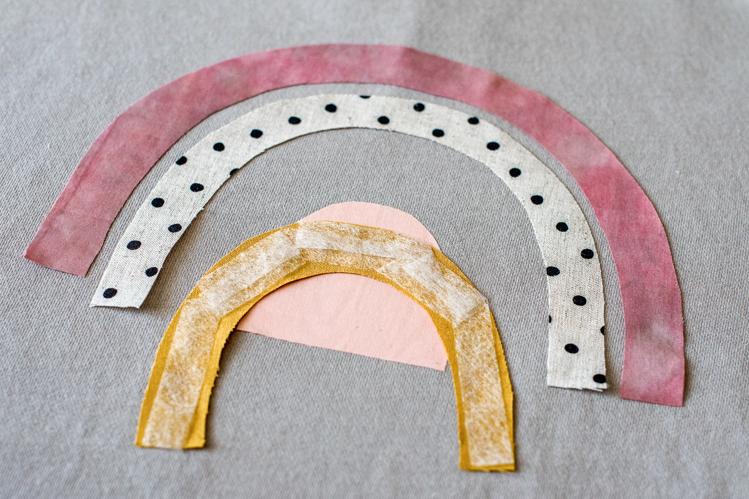 3. Cut your stitch witchery to fit your pattern on the backside. Depending on the size of your pattern you could also use the kind of fusible bonding that comes in sheets or on a roll, but this is what I had on hand and it worked great for my smaller pieces of fabric. 🙂 Decide where you want the pattern to be and then follow the directions for the fusible bonding you’re using, mine said to use a cloth in-between and a hot iron set to wool. I repeated my steps to finish the other parts of the rainbow and ran the iron o