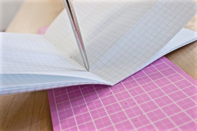 4. To create your sewing holes, place your template inside your 8 folded sheets. Hold the spine over a self-healing mat (to protect your work surface) and push down with an awl over each of the three markings you made. You want the holes to be large enough for your needle to easily pass through, so push down on your awl with medium force, and rotate your tool in a clockwise motion to widen the hole.