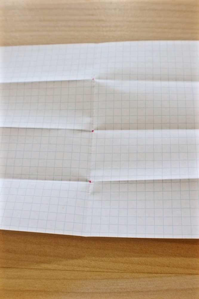 3. To make your template, take 1 sheet and fold to the above dimensions. With your folded side facing to the left, bring the top down to meet the bottom and press down to fold. Fold in half again, so that you have a long rectangle. Open up and make a dot at each of the three intersections.