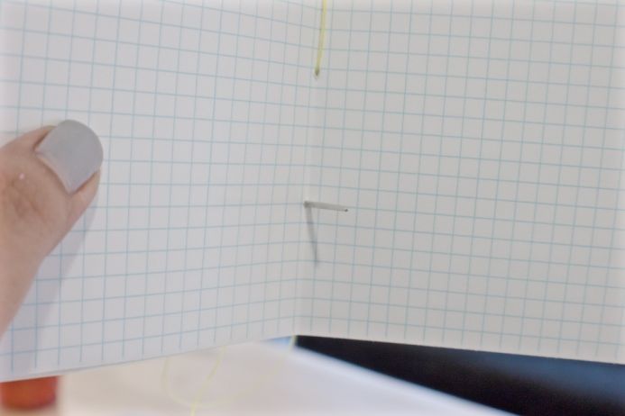 6. Next, insert your needle in the top hole, going from the inside pages through to the cover. Pull taut.