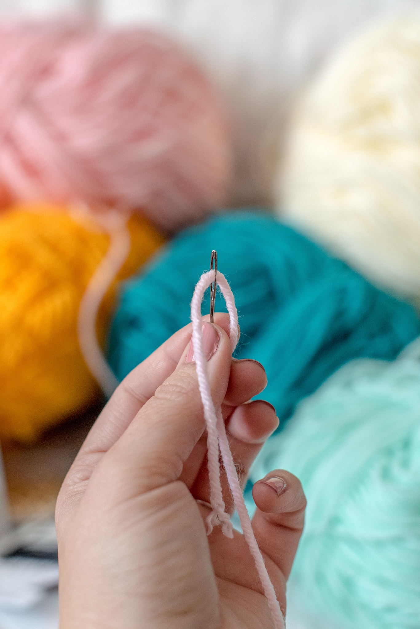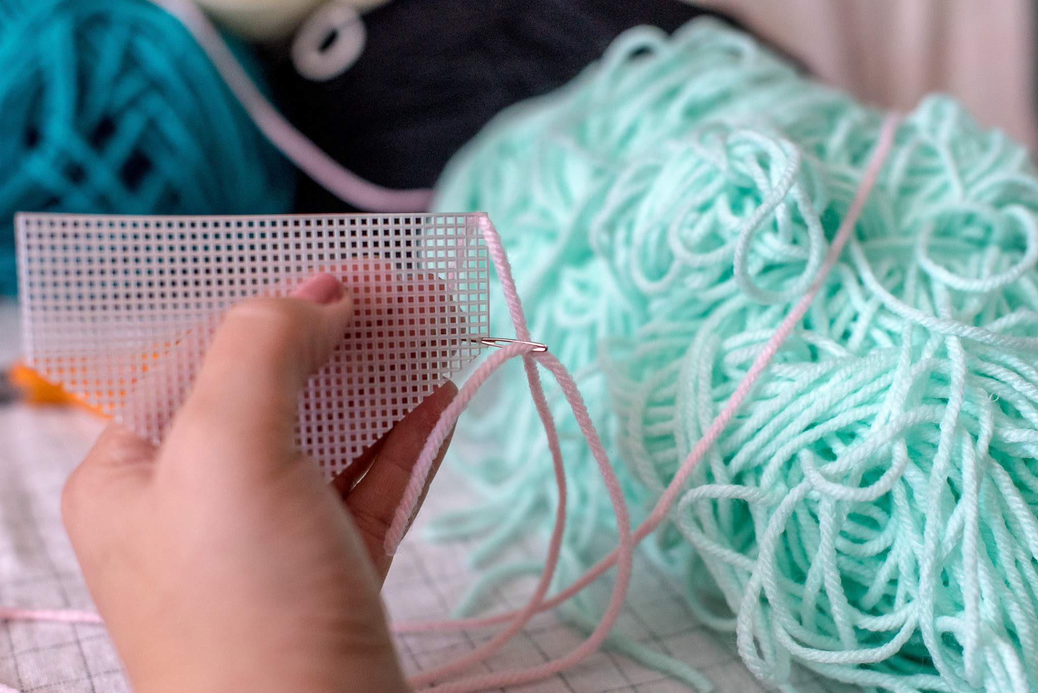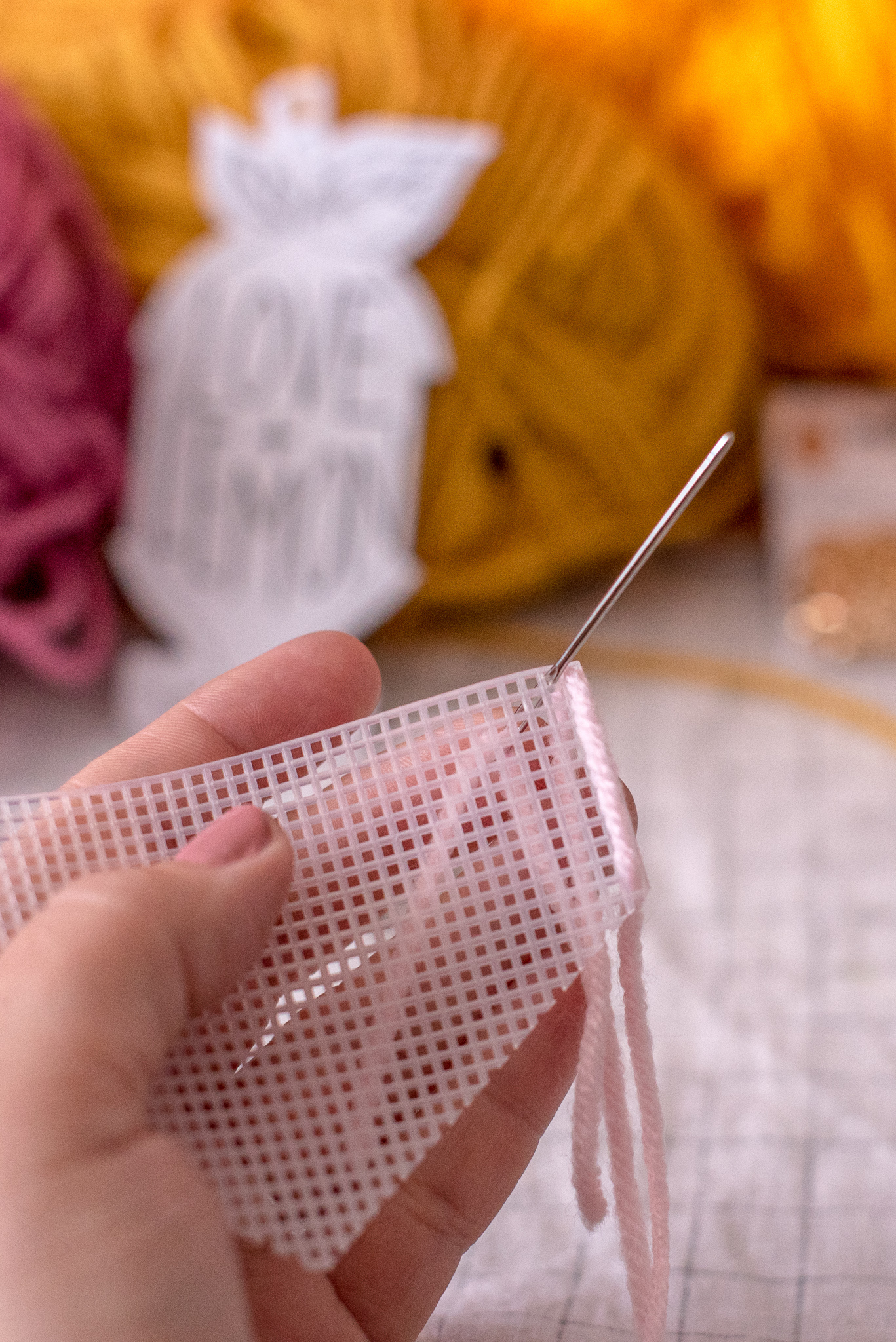 *Tip: it’s easiest to keep your stitching consistent if you count the same amount of boxes on each side and cut from there. Load your tapestry needle with about an arms length of yarn, don’t knot it.