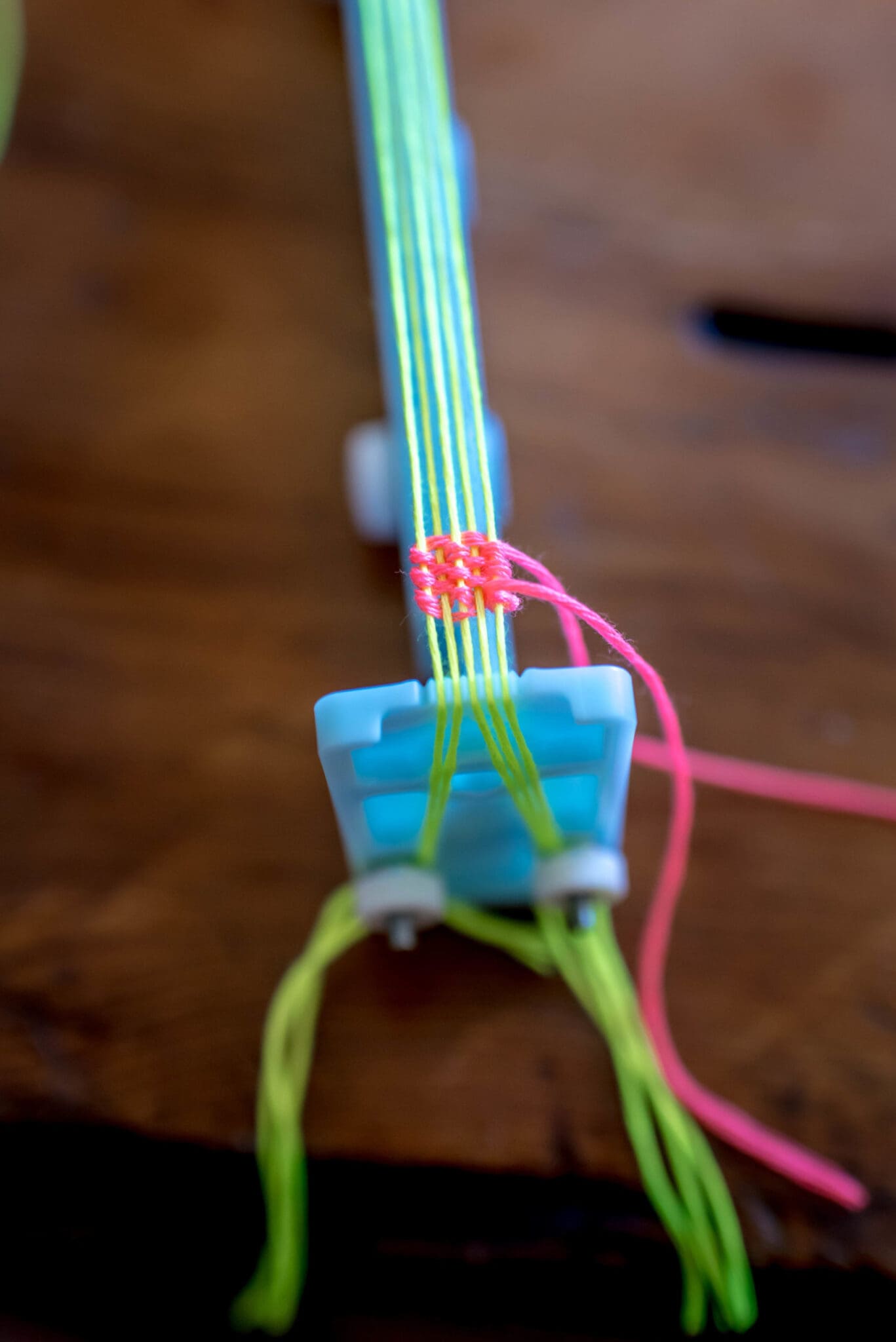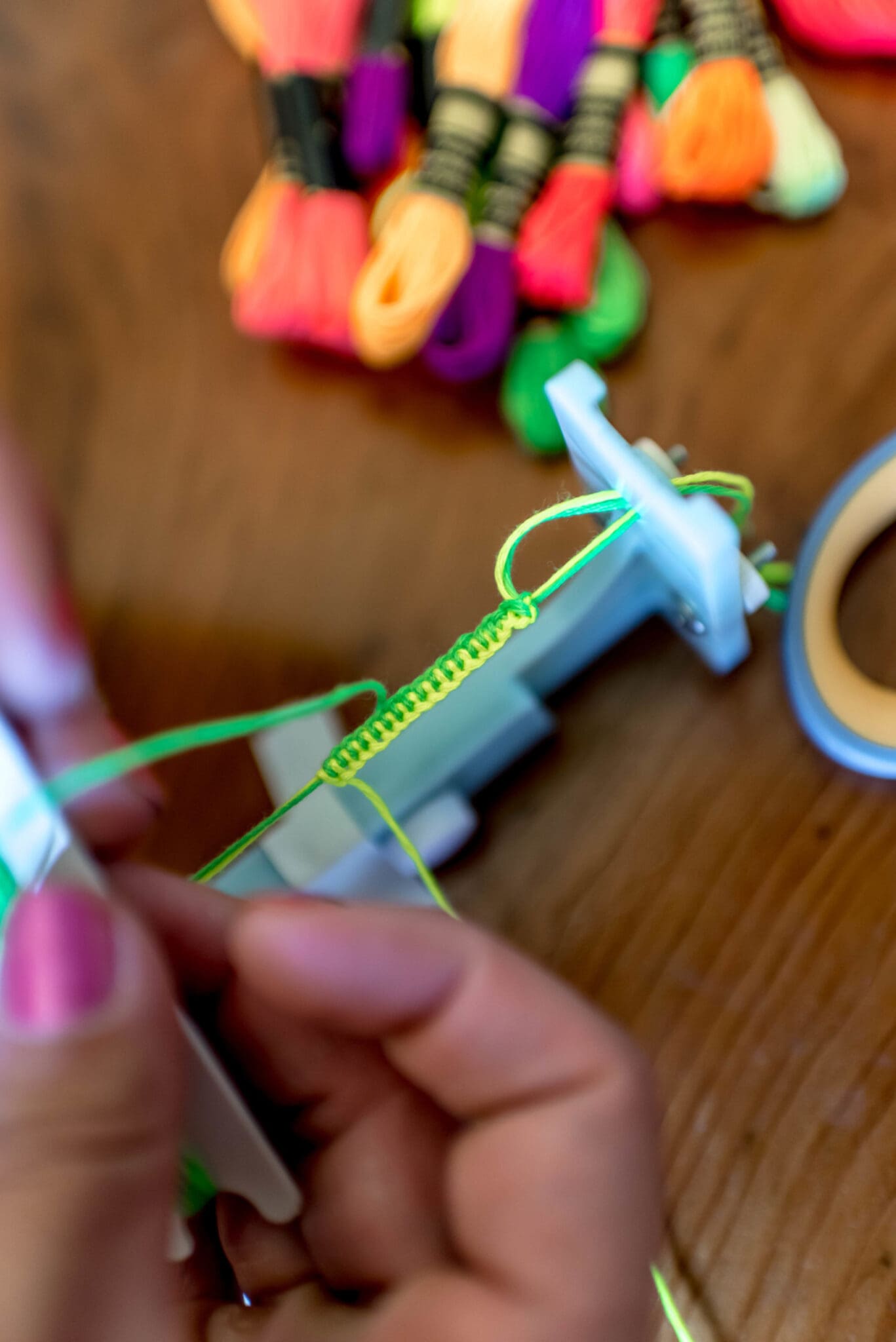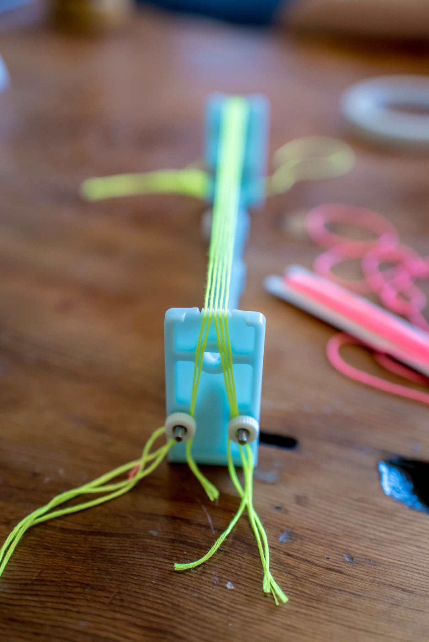 Load the bracelet maker how it corresponds to the bracelet you chose to make. Since I was making the weaving style, I loaded the maker with 5 strands of embroidery floss as my Warp. For this style, it’s easiest to start with an odd number of warp threads.