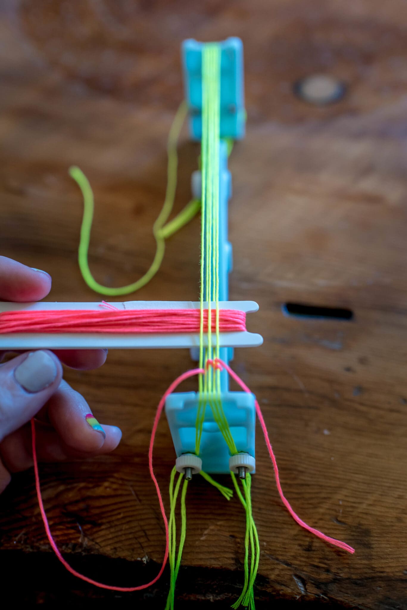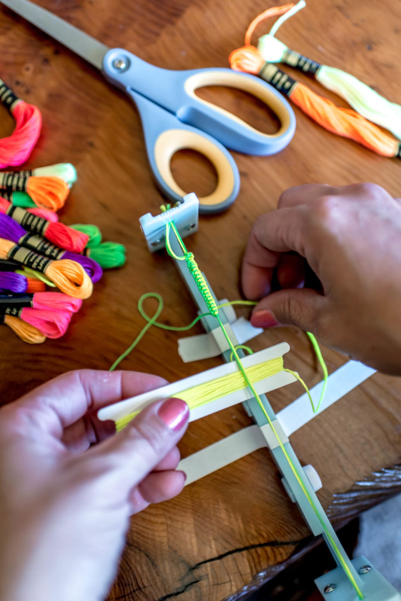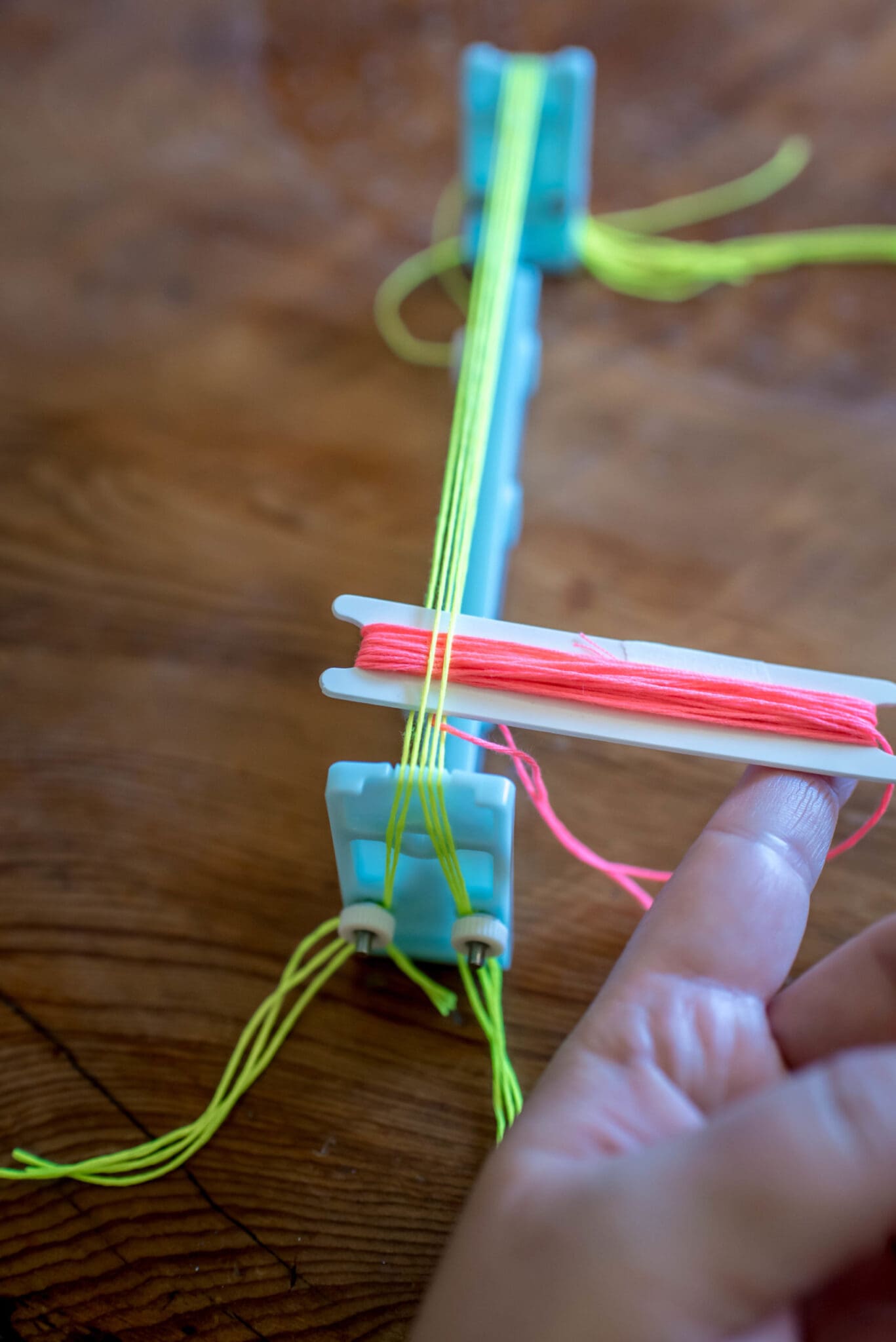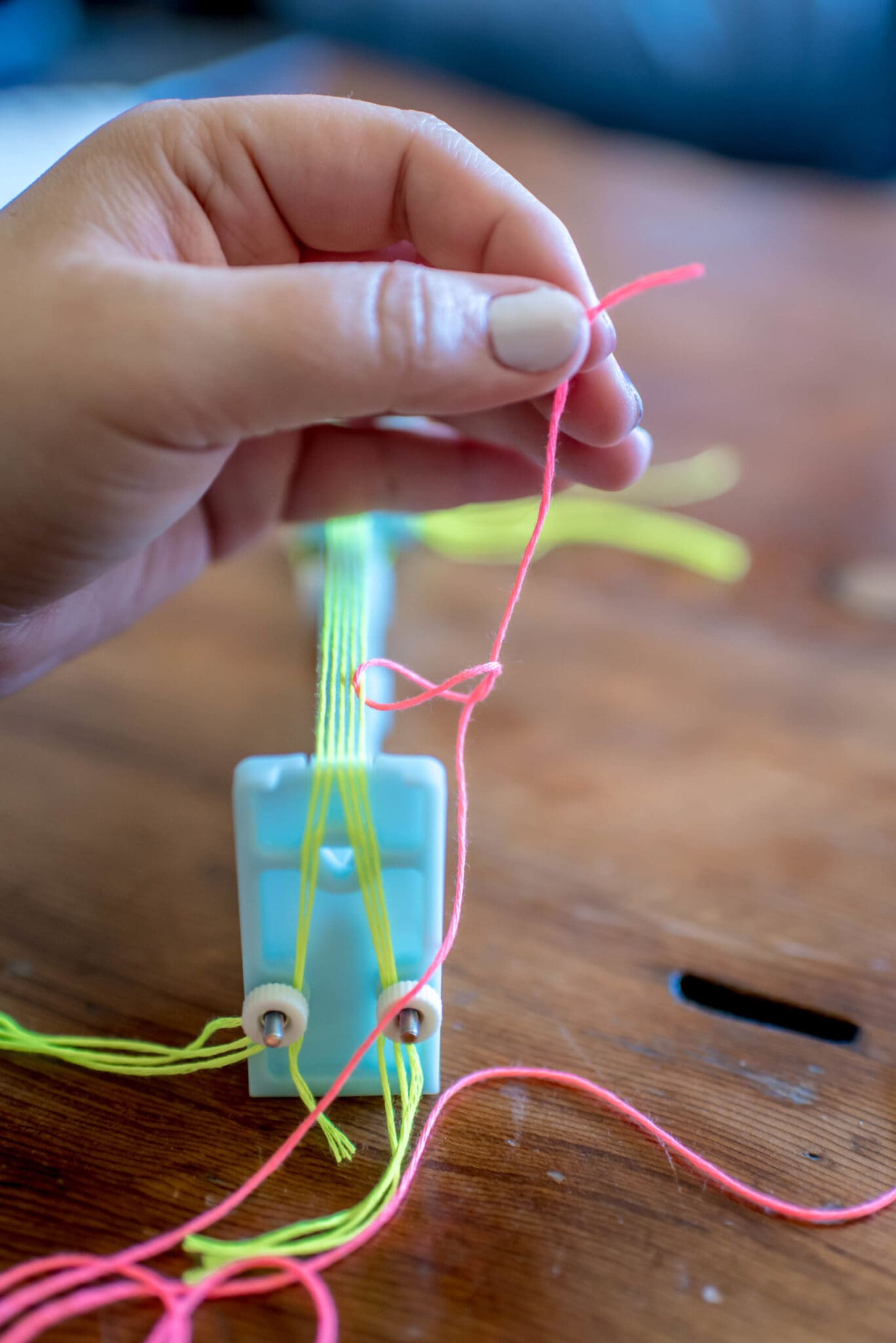 Load the bracelet maker how it corresponds to the bracelet you chose to make. Since I was making the weaving style, I loaded the maker with 5 strands of embroidery floss as my Warp. For this style, it’s easiest to start with an odd number of warp threads.