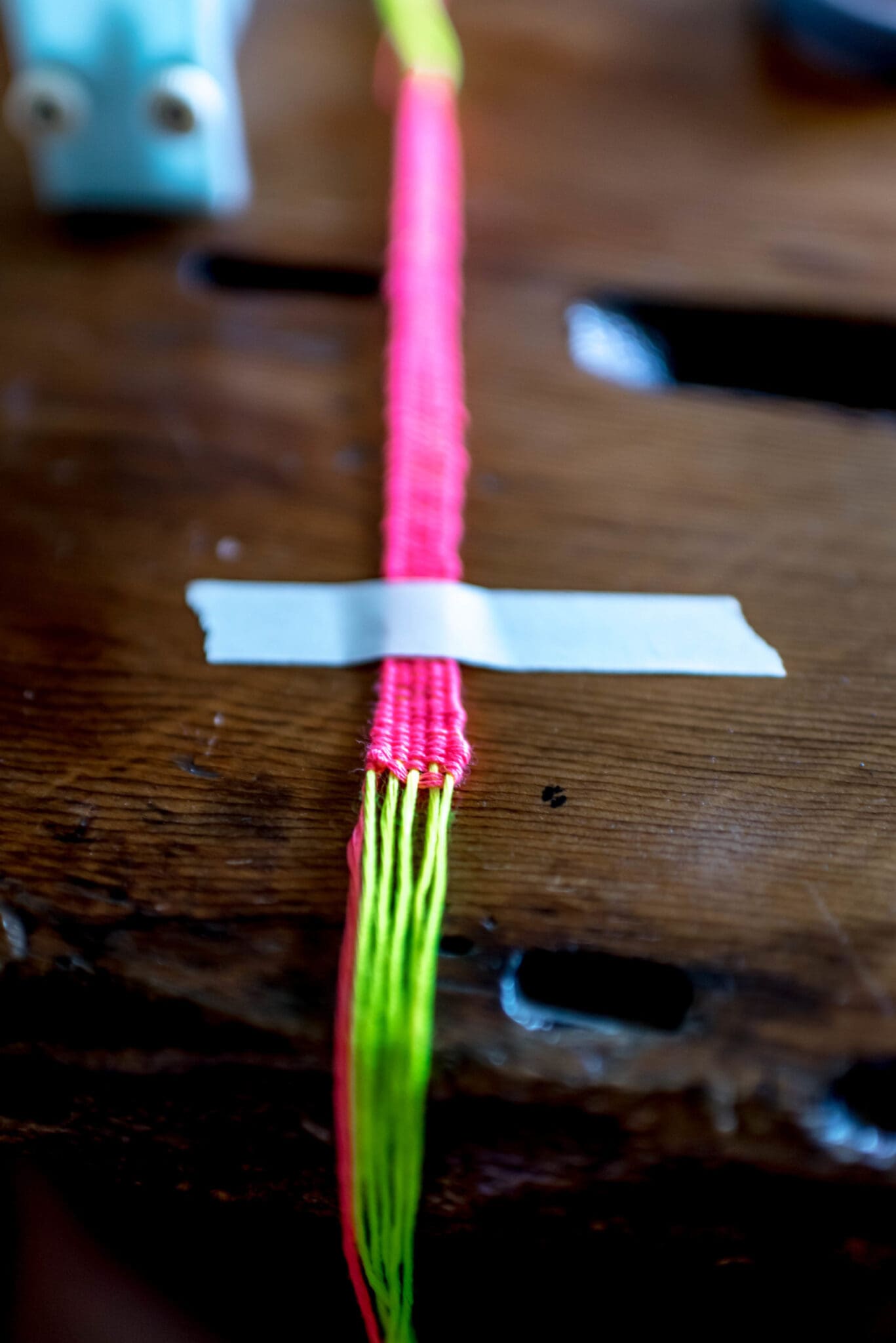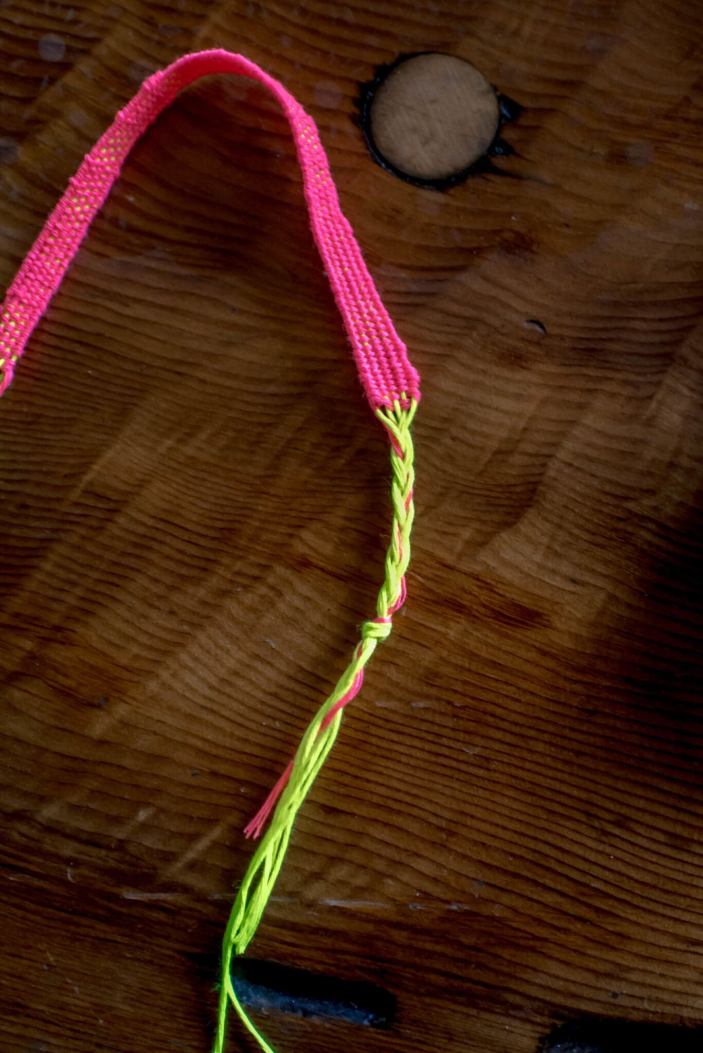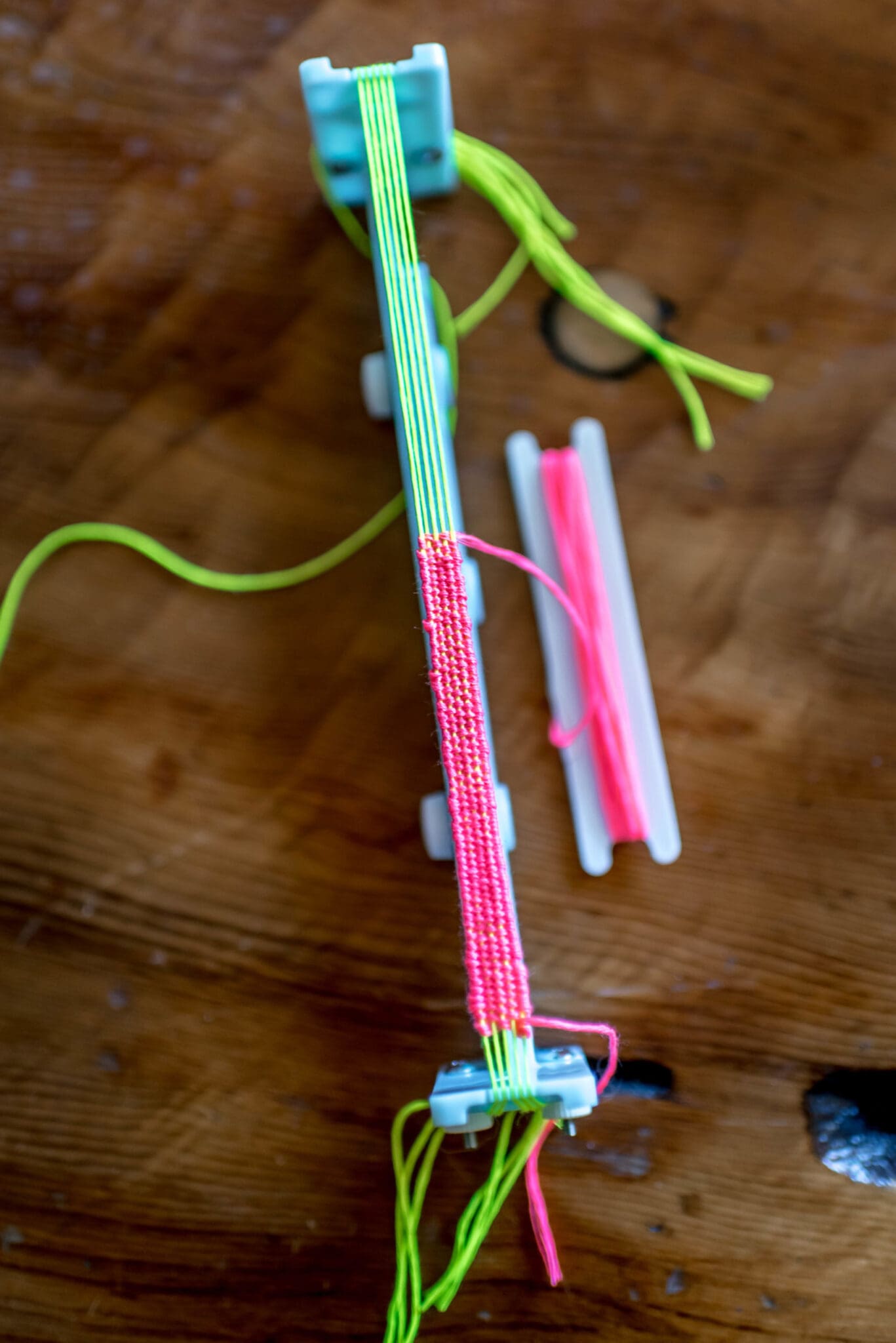 Continue weaving until the bracelet is the length you’d like it to be. Keep in mind that you will use the warp threads to tie off the ends of the bracelet. Once mine was the length I wanted it, I tied a knot off with my weaving thread, just like I had to start it, but on the opposite end.