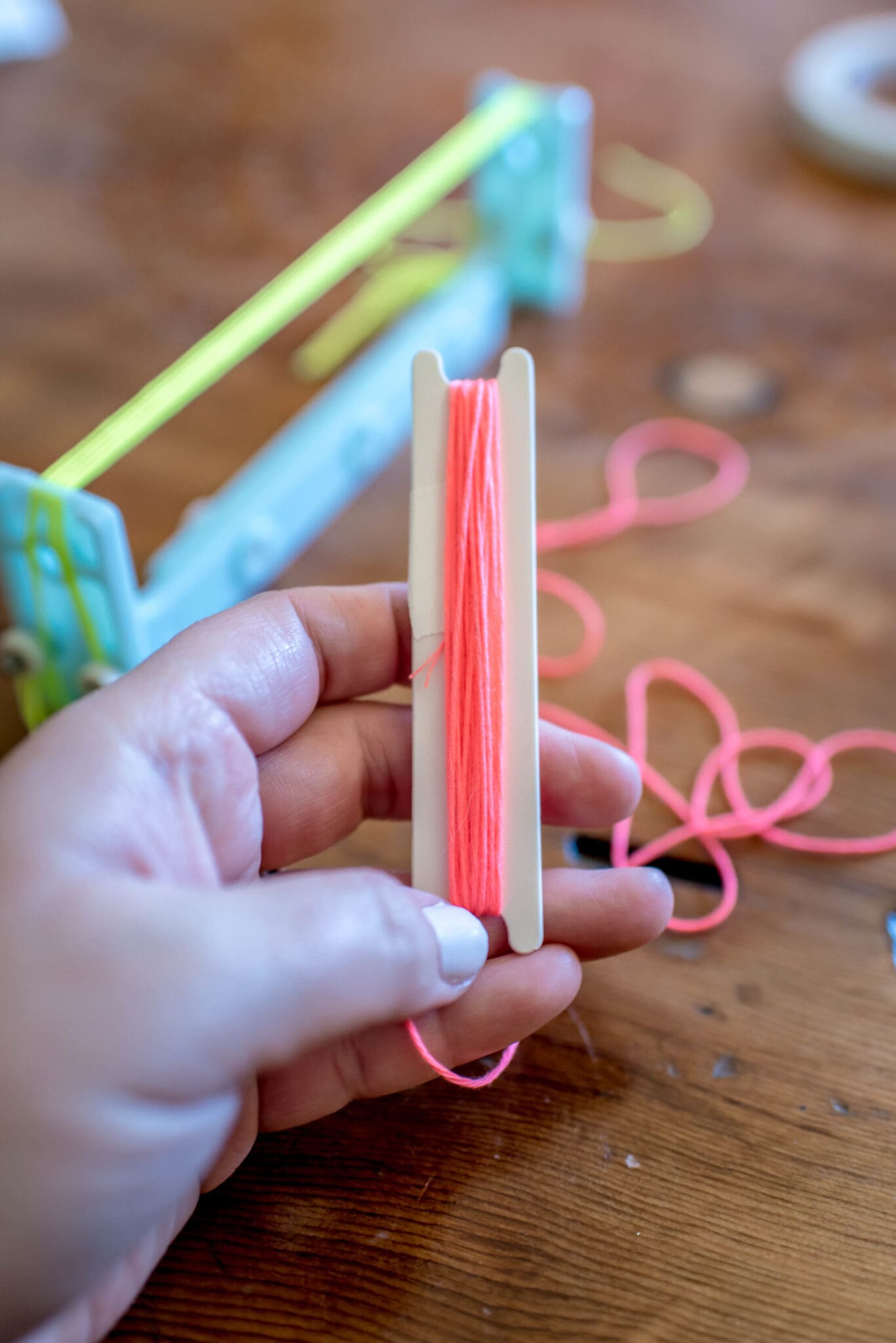 I took all of the warp threads off of the maker and then braided them together and tied a knot at each end to secure all the threads together. Cut off any excess threads, and you’re done!