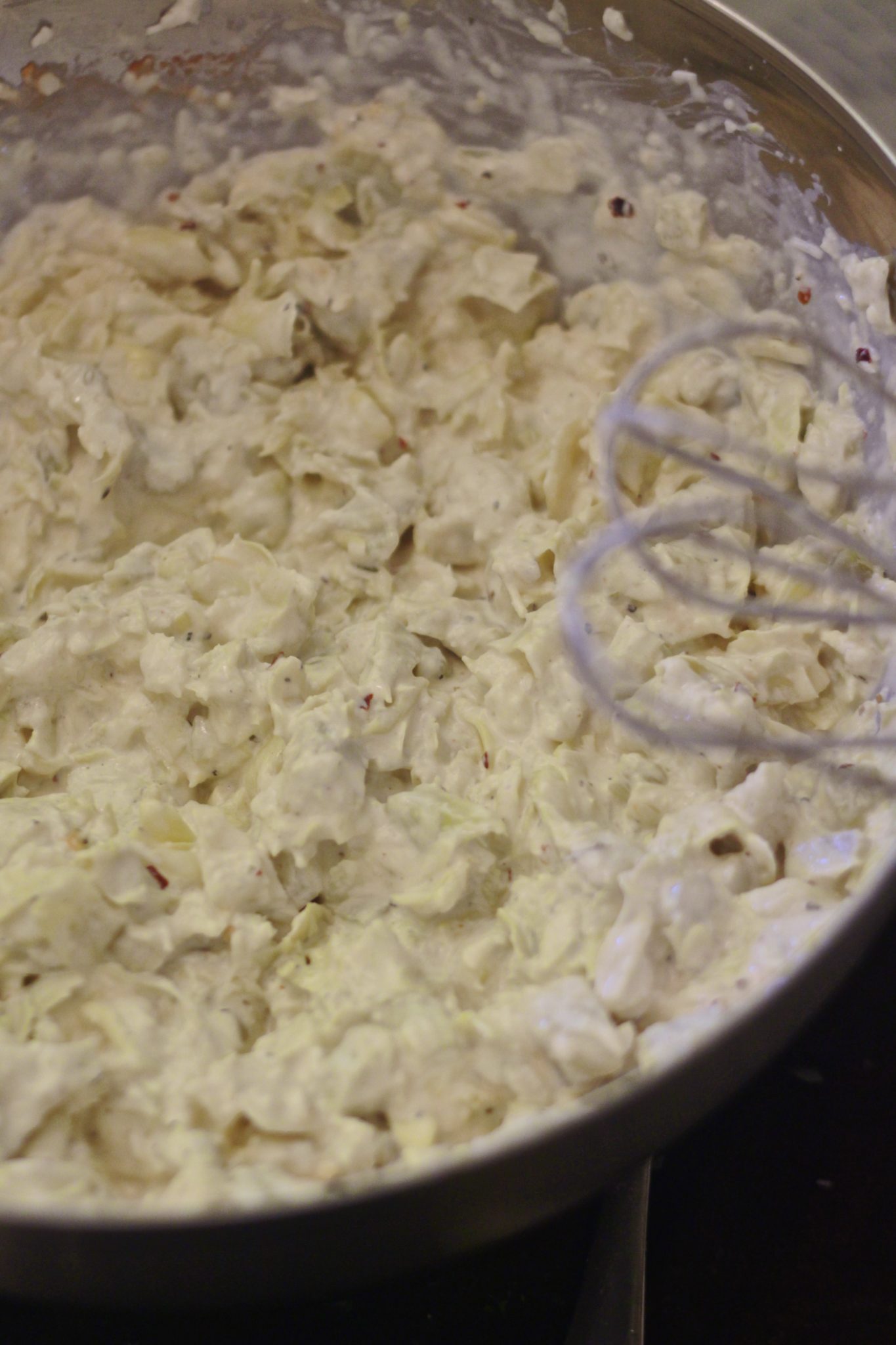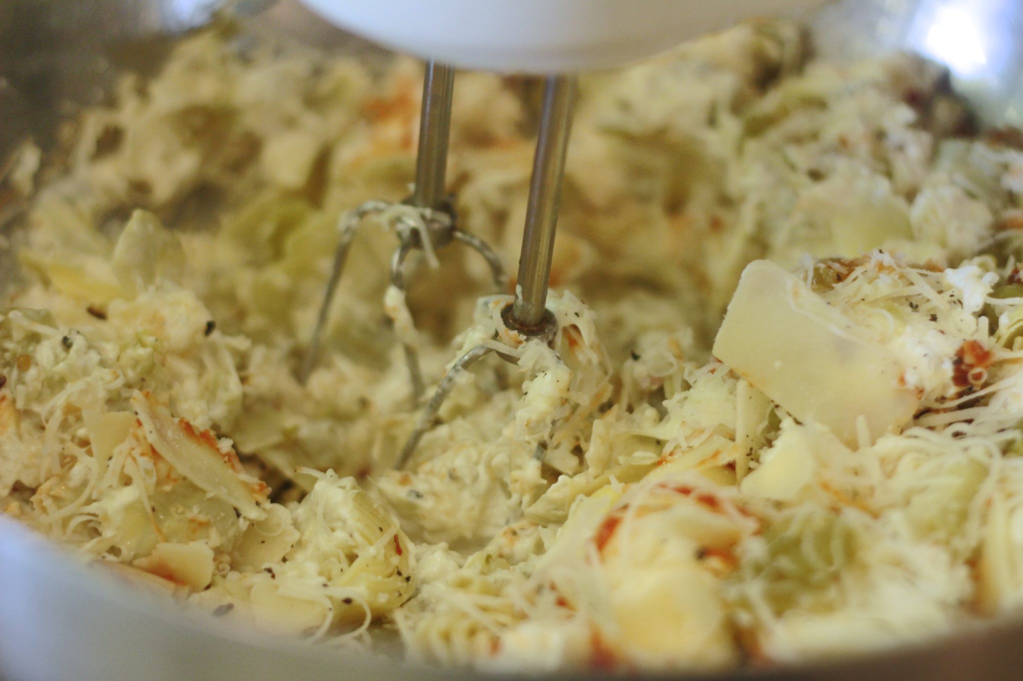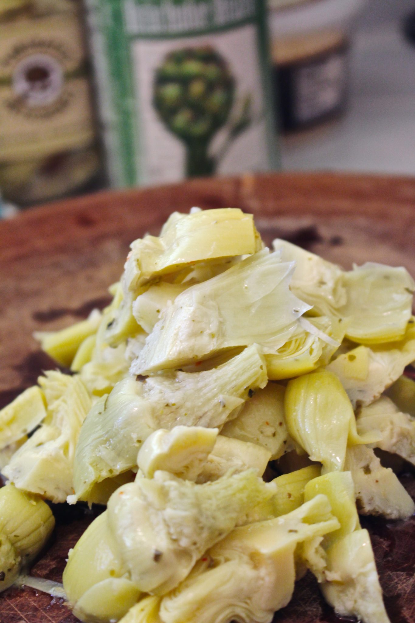 -3 12 ounce cans of artichokes (I used 2 cans of marinated artichokes and 1 can of no-marinated artichokes)