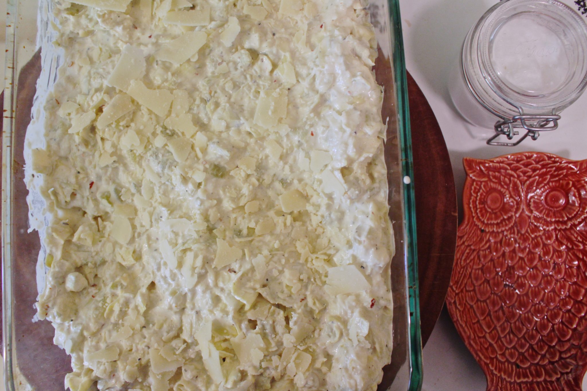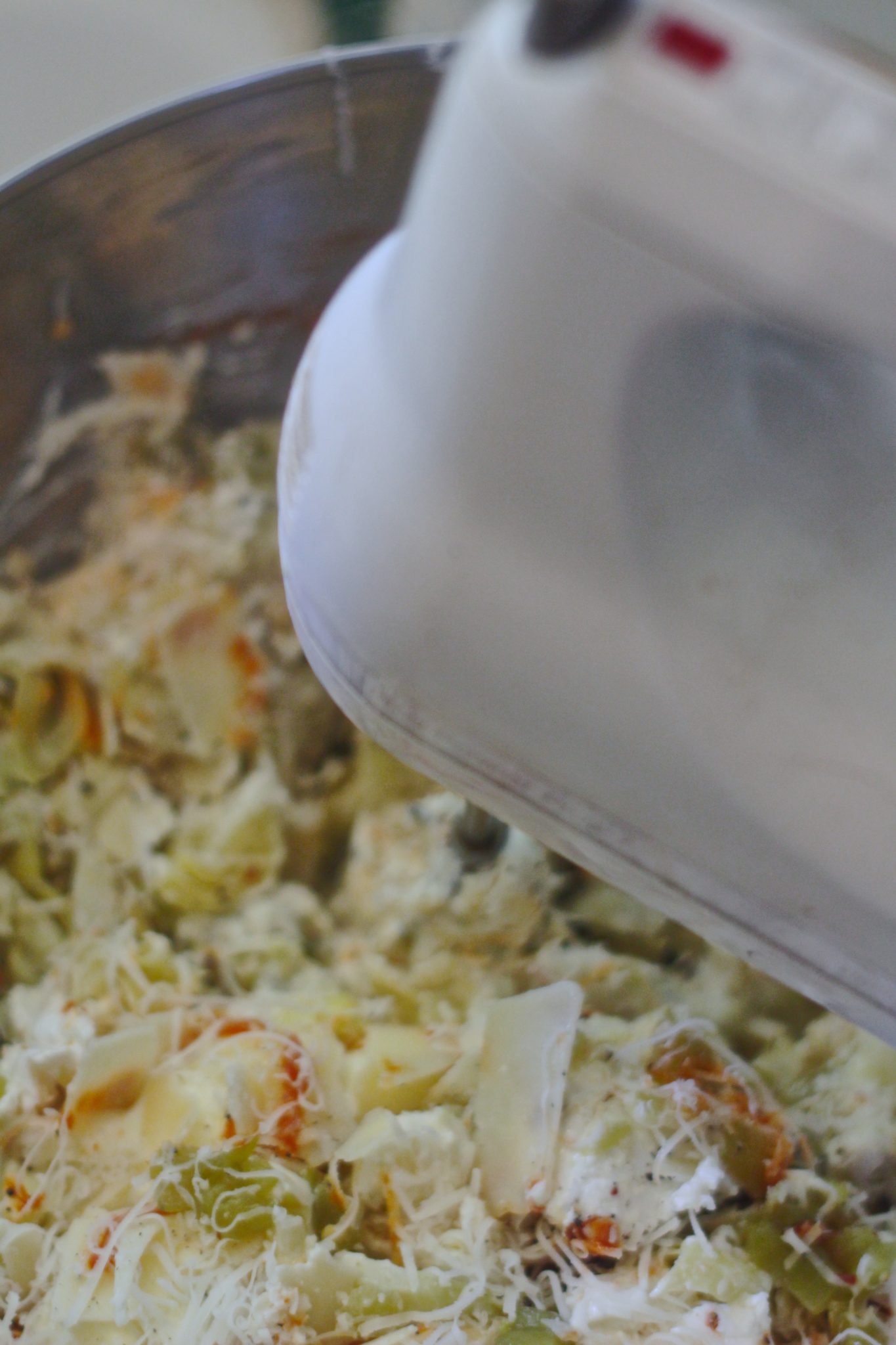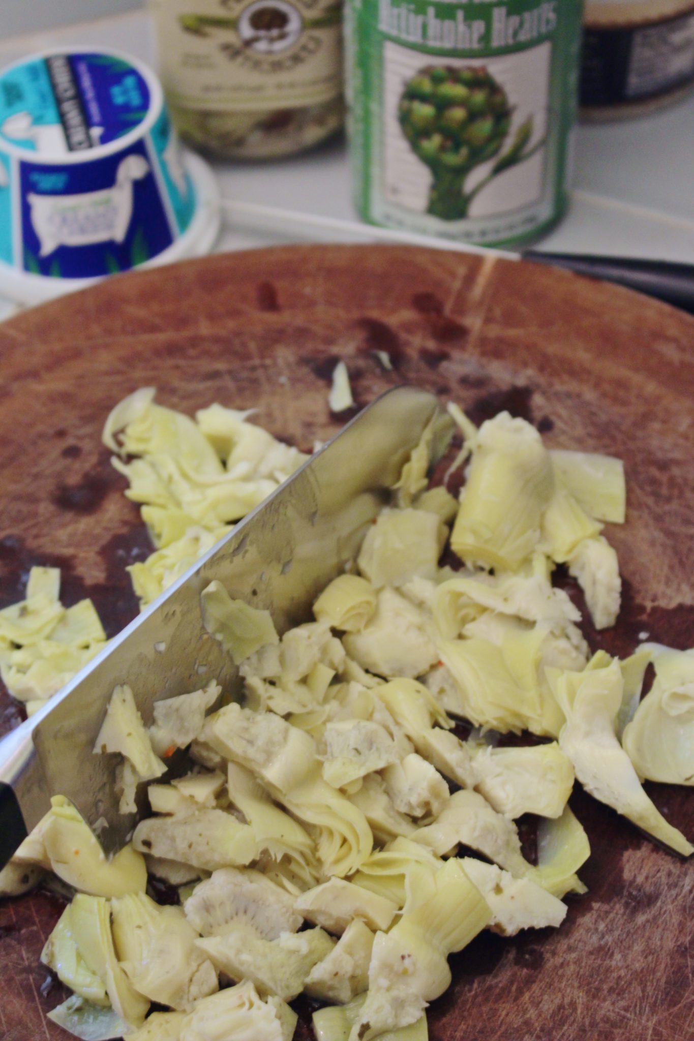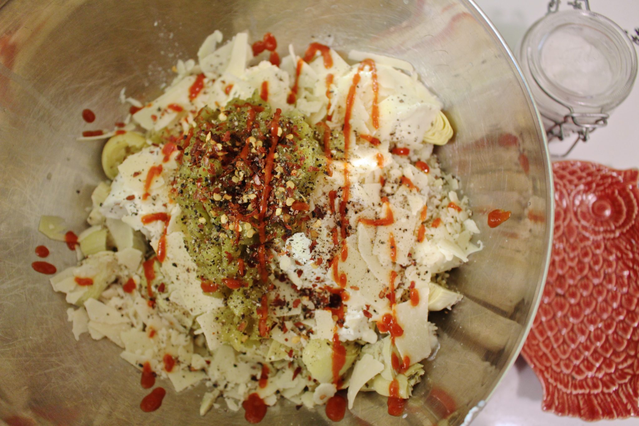 Years later when I was throwing a party in my own house, I thought about her artichoke dip and called her up to get her recipe. That first time I made it, I followed her recipe exactly. As the years went on I started getting creative and putting my own spin on it. I added Sriracha for an extra kick. When dairy became something my body no longer tolerated, I stopped making the artichoke dip completely. When I realized that dairy made from goats milk was easier on my stomach, I adjusted her recipe again and substituted goats milk cream cheese and goats milk cheese for the cows milk that was in the original one. Honestly, this isn’t the perfect appetizer if you’re super health conscious or on a diet but once you taste a bite, you might be willing to let your regime go, and dig in.