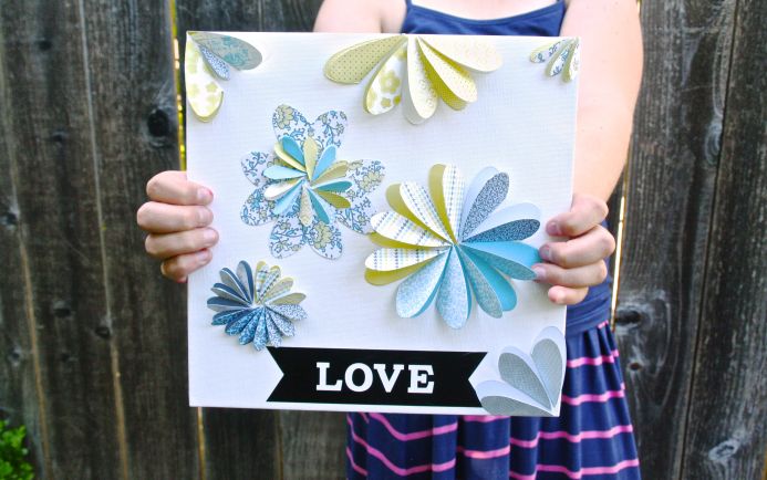 I’ve always loved watching my kids make things. My oldest daughter takes after my husband in her love of art. She’s been sketching, and drawing, and dreaming since she was very little. She asked me one day if she could do a project with me and we came up with this idea of creating a flower made of heart shapes glued on a canvas. It’s a fun, simple project that is extremely easy to do with kids! There are also many different ways to personalize it. And the Sizzix machine is amazing to use on this project, because it’s super safe to use, and kids can totally be hands on and help cut out the shapes. This is a great little gift for a mom, or a grandma, or just to put up on your own mantle!