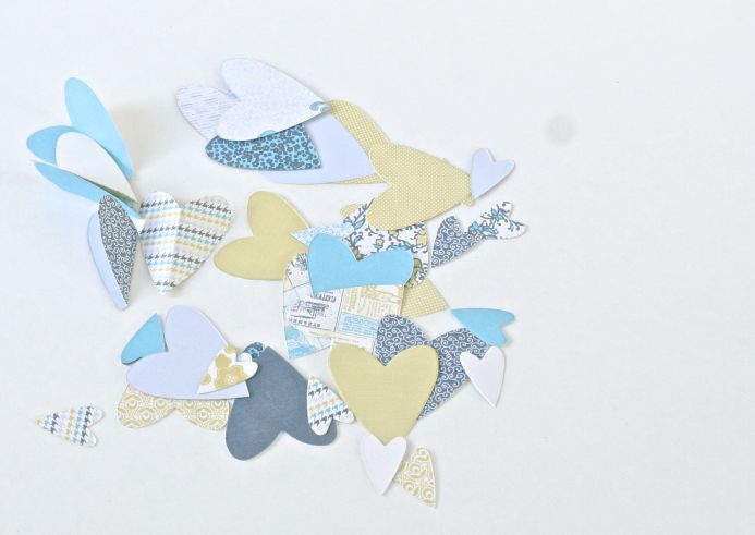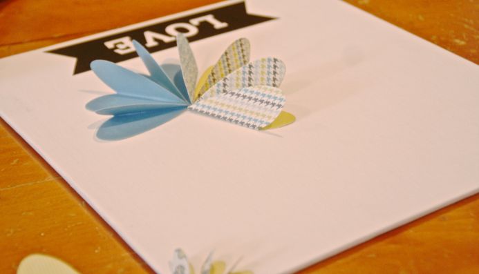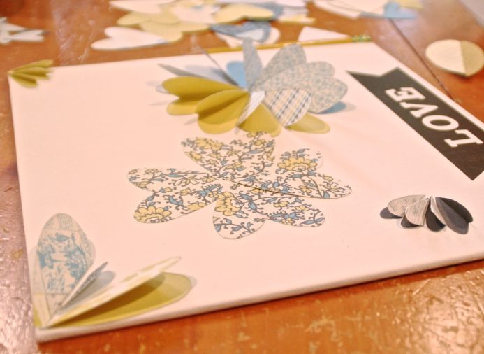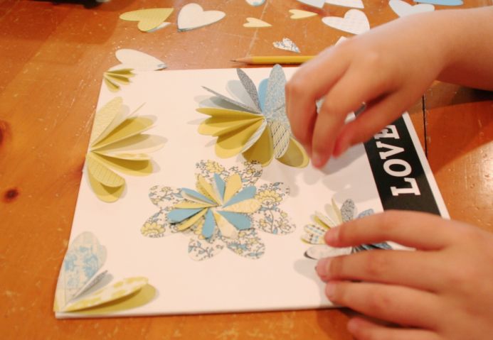 5. Folding the hearts in half, lay them in circles to create flowers on the canvas.