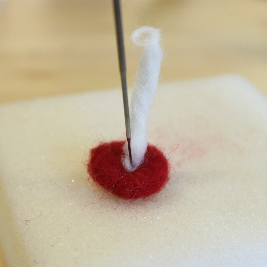 4. Attach the stem to the underside of the mushroom cap by place the loose fibers of the stem to the center of the cap and use shallow pokes. If you apply too much pressure, the white fibers from the stem may show on the top of the mushroom cap. Finish your mushroom by felting a thin strip of white roving around the stem on the underside of the mushroom cap. Again, use shallow pokes as to prevent seeing unintentional white fibers on the top of the mushroom cap.