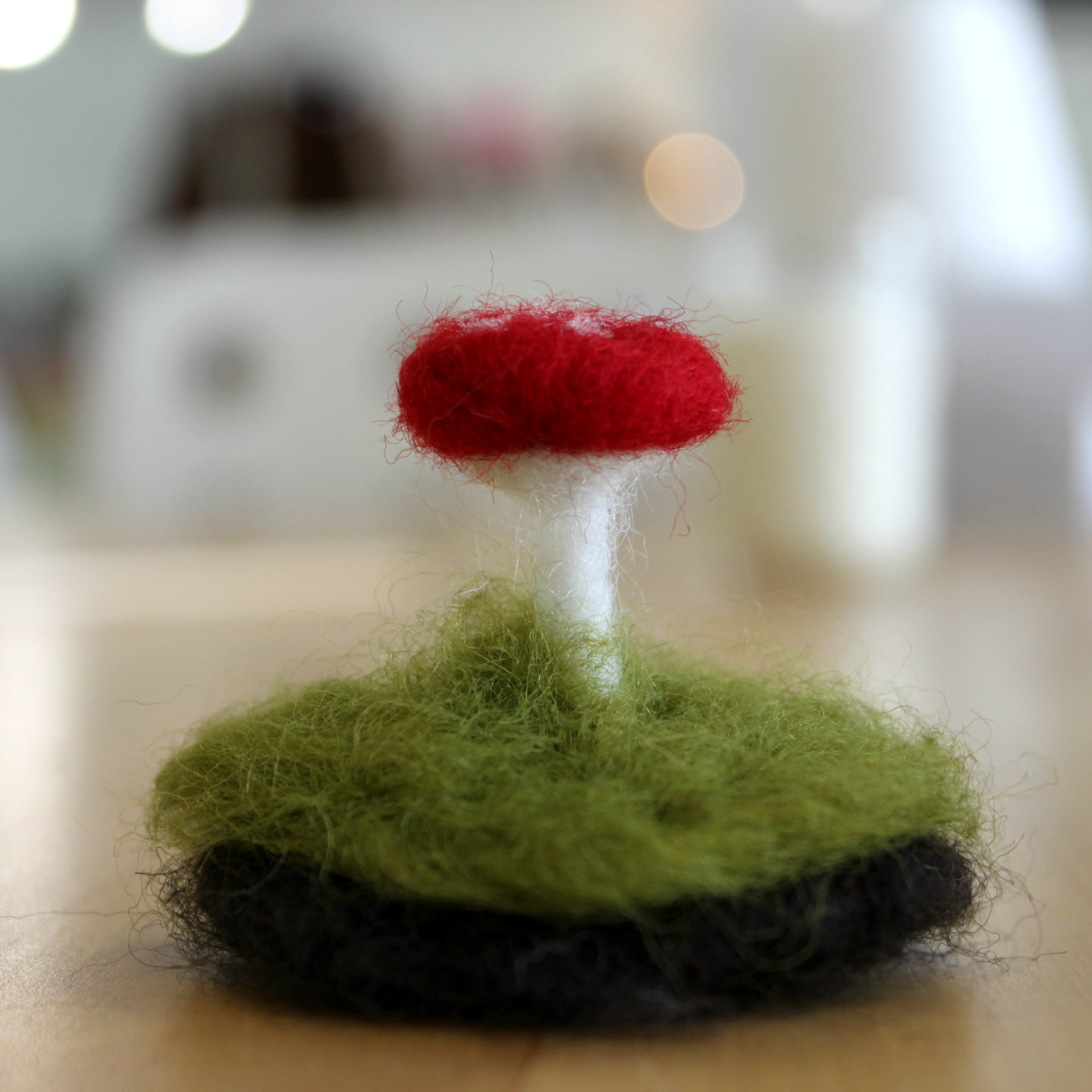 5. Create the ‘dirt’ layer by pulling off a tuft of roving just slightly larger than the diameter of the bottom of your glass vessel, and felt a circular shape like we did for the mushroom cap in step 1. Periodically place your dirt layer in the vessel to make any adjustments to the shape or size. When you’re ready to attach your mushroom, place the bottom of the stem of the mushroom in the center of the dirt layer and begin felting.