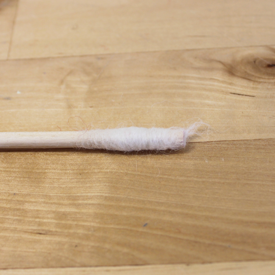 3. Make the stem of your mushroom by wrapping a thin piece of white roving tightly around a small wooden dowel. Slide roving of the dowel and transfer to your foam pad to begin felting. Felt around the center and leave the wool fibers at booth end of the stem loose.