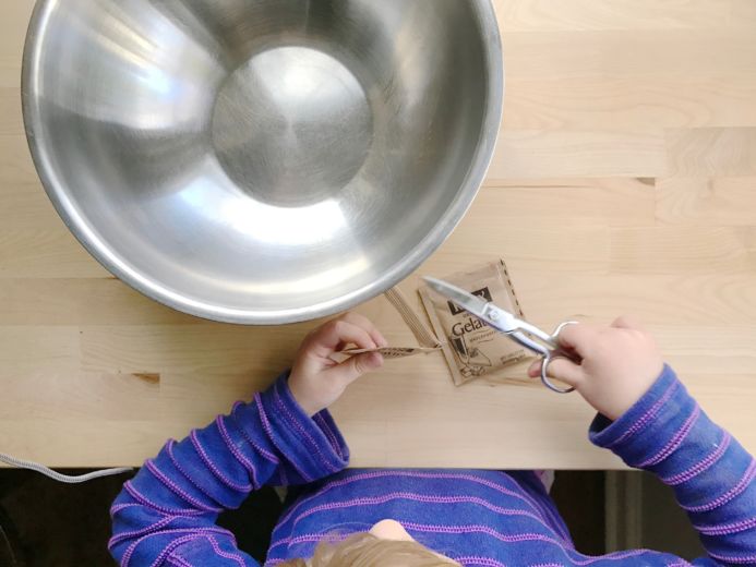 To use my preschooler’s metric for the passage of time, we were back at it a few ‘sleeps’ later. (I needed a cooling down period.) This time, we went with the box of Knox gelatin. (The recipe I’m including below reflects this far more manageable option.) Alas, this version may not be fortified with an exotic superfood, but the ornaments do the thing they’re supposed to do–stick together and hang. Which is a nice way of summing up our entire experience of trial and error, blunder and success. Through it all, we kept at it, together, until we got it right in the end.