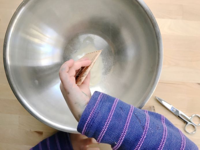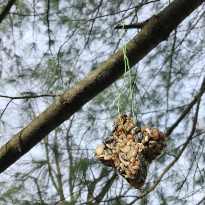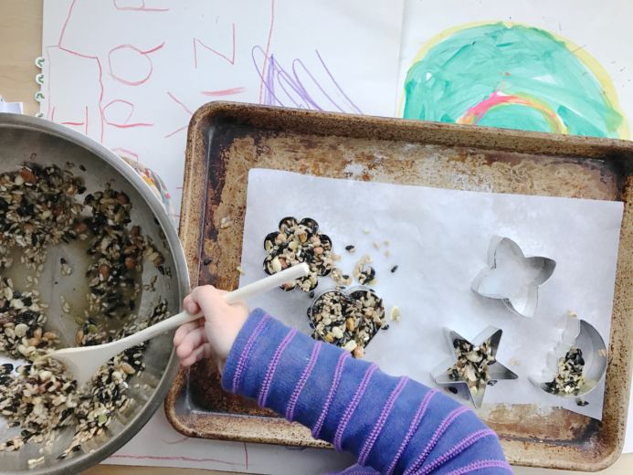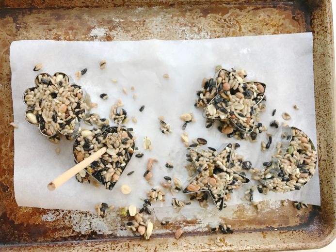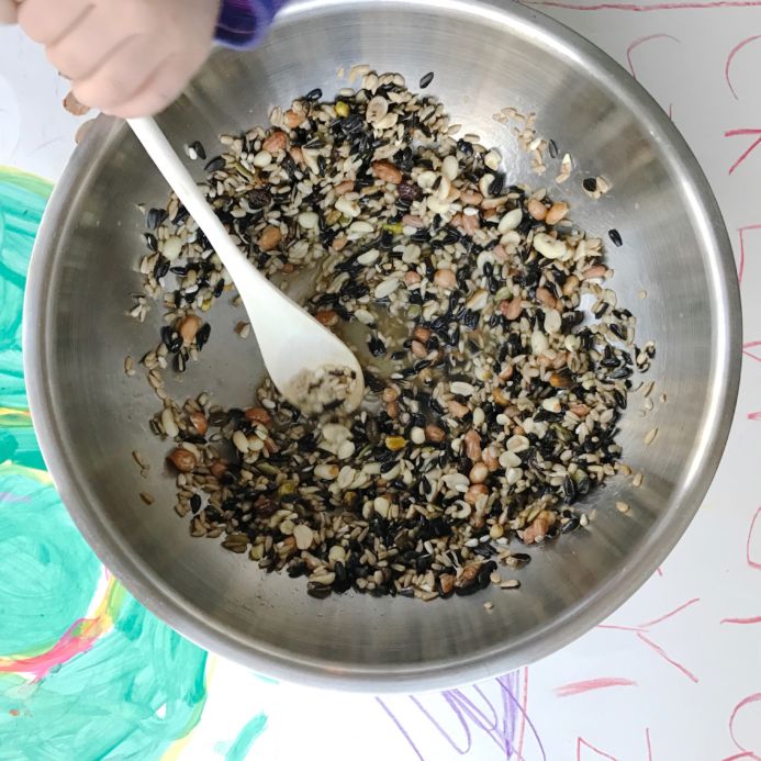 My first instinct was to go healthy for our flying friends. (Gelatin? Isn’t that made from cow hooves?) We had to go with the coconut oil. And then I found myself heating said oil to boiling on a play date with three kids under five. I am fairly certain I found myself yelling DANGER more than once. After things had cooled down, the kids enjoyed the hands-on experience of mixing the seed and oil together, so much so that they were slathered in it, in a matter of seconds.