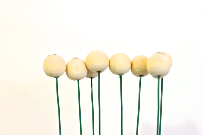 Step 2: Moving quickly, apply hot glue in the hole of one end of your bead, and then turn over and apply more hot glue in the other hole and place your stick about half way in. Let dry.