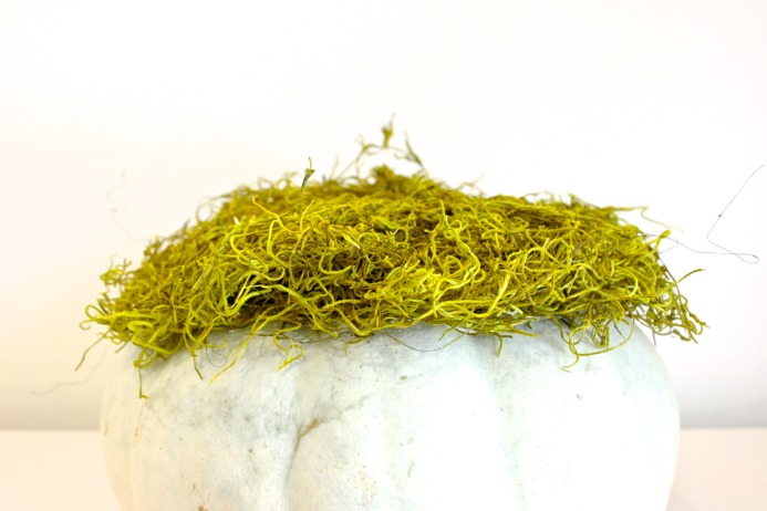 Step 1: Cut the stem off your pumpkin. Apply very generous amount craft glue on the top of the pumpkin. Then lay a fluffy bed of moss on top of the glue. Let dry overnight.