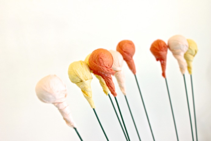 How to Make DIY Fall Paper Flower Pumpkin Decor on Dear Handmade LifeStep 3: Cut out a 2” round piece from crepe paper and place over the top of the bead, fold over toward the bottom and twist. You can apply a small bead of hot glue to help keep the crepe in place.How to Make DIY Fall Paper Flower Pumpkin Decor on Dear Handmade Life