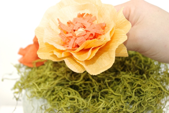 How to Make DIY Fall Paper Flower Pumpkin Decor on Dear Handmade LifeStep 9: Place a generous dab of hot glue along the stem and stick in the moss.