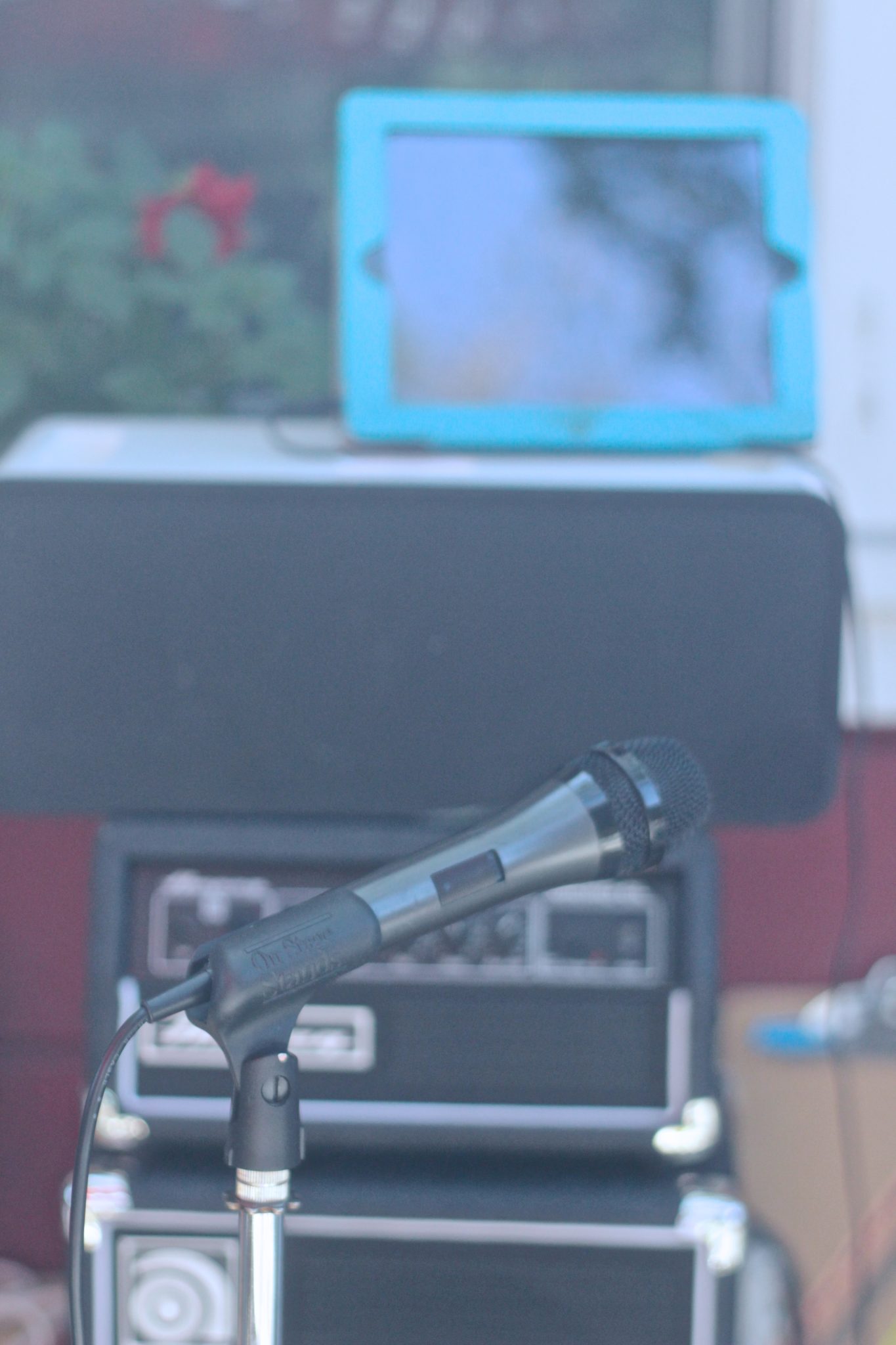 1. Connect your iPad to the stereo using the cable. Then set it up on a high table of some stacked boxes so that it’s facing where the singer will be.