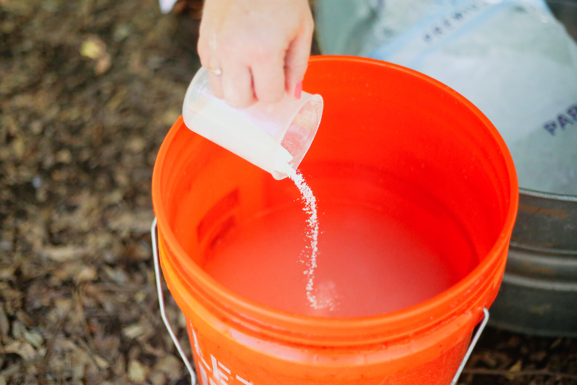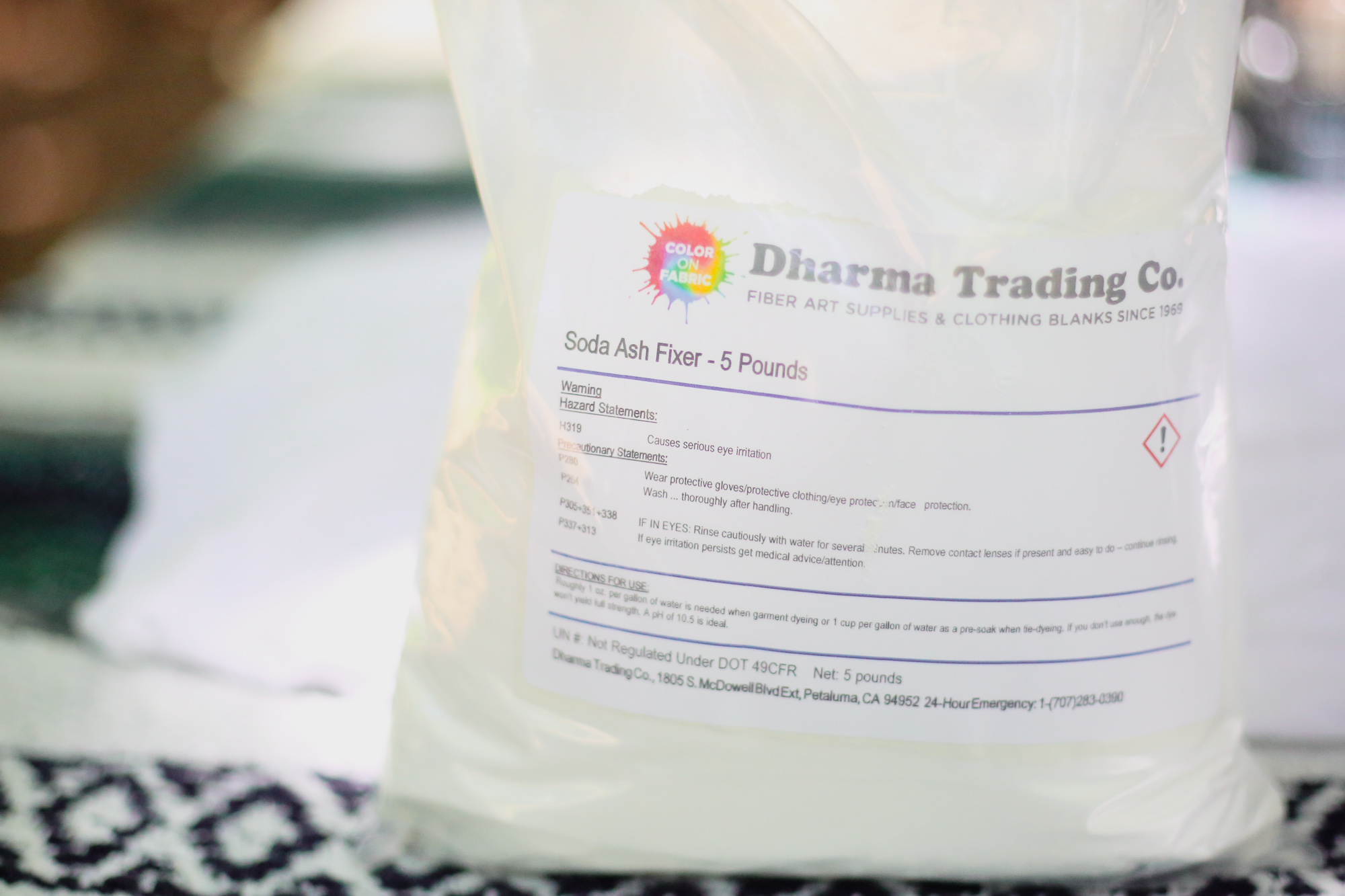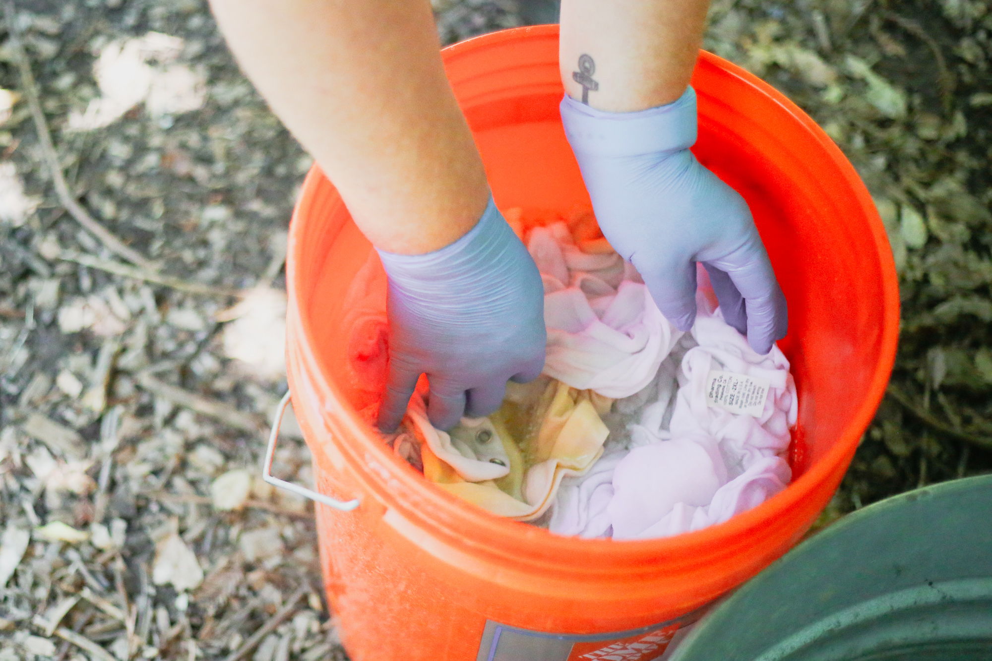 - While your garment is washing, prep the soaking solution – You will need 1/3 cup of soda ash mixed with 3 gallons of warm to hot water (pro-tip: use warm water to soak the soda ash – it will make the colors more vibrant and the soda ash easier to dissolve into the solution)