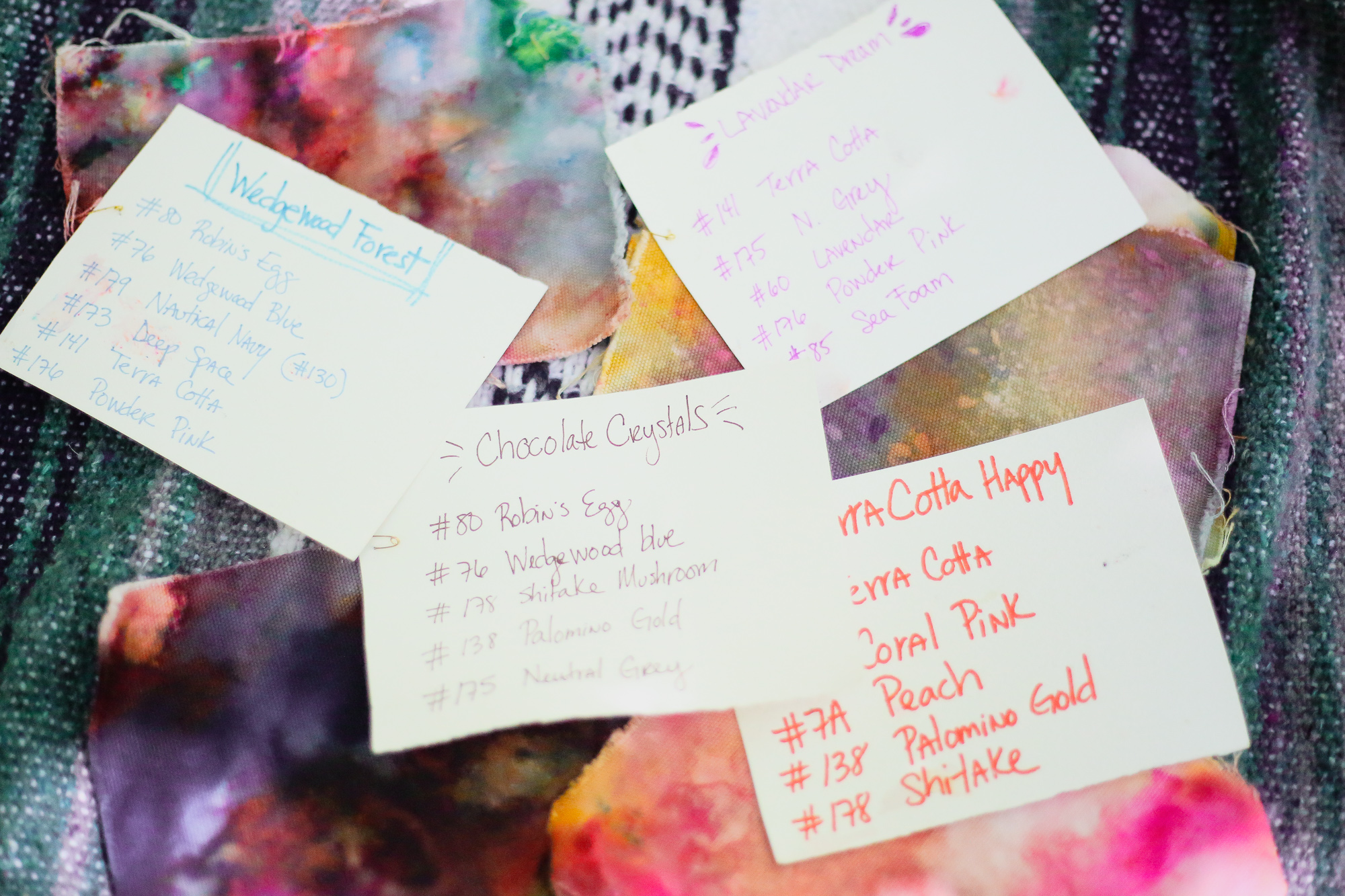 - Once you have the ice on the fabric, you can begin adding the dye. (Again, wear gloves for this part) I recommend sprinkling the dye onto your fabric with a small spoon – you should also try just sprinkling with your fingers. The lighter the color application, the lighter and dreamier your end result will be. Try to stick to only 3-4 colors per single project otherwise, your results could end up muddy. Don’t worry if it looks dark after you add the color, it will dilute with the ice and lighten when you rinse. Notes about colors: Each dye is made up of several pigments. When you sprinkle the powdered dye, you will see all the color pigments that make up the dye color – as the ice melts, some of these pigments will separate out which makes ice dying extra magical because you never know what you will get!