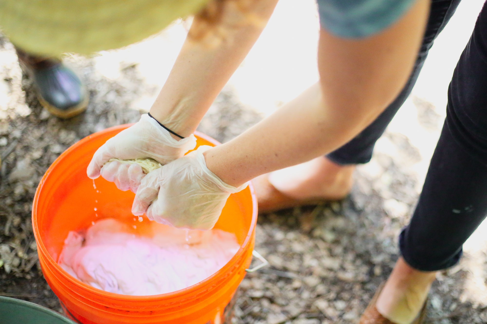 - Prep your fabric – pre wash using a mild detergent. There is no need to dry your fabric if you are going to dye right away. If you plan to dye later, make sure to dry the fabric or it will mildew.