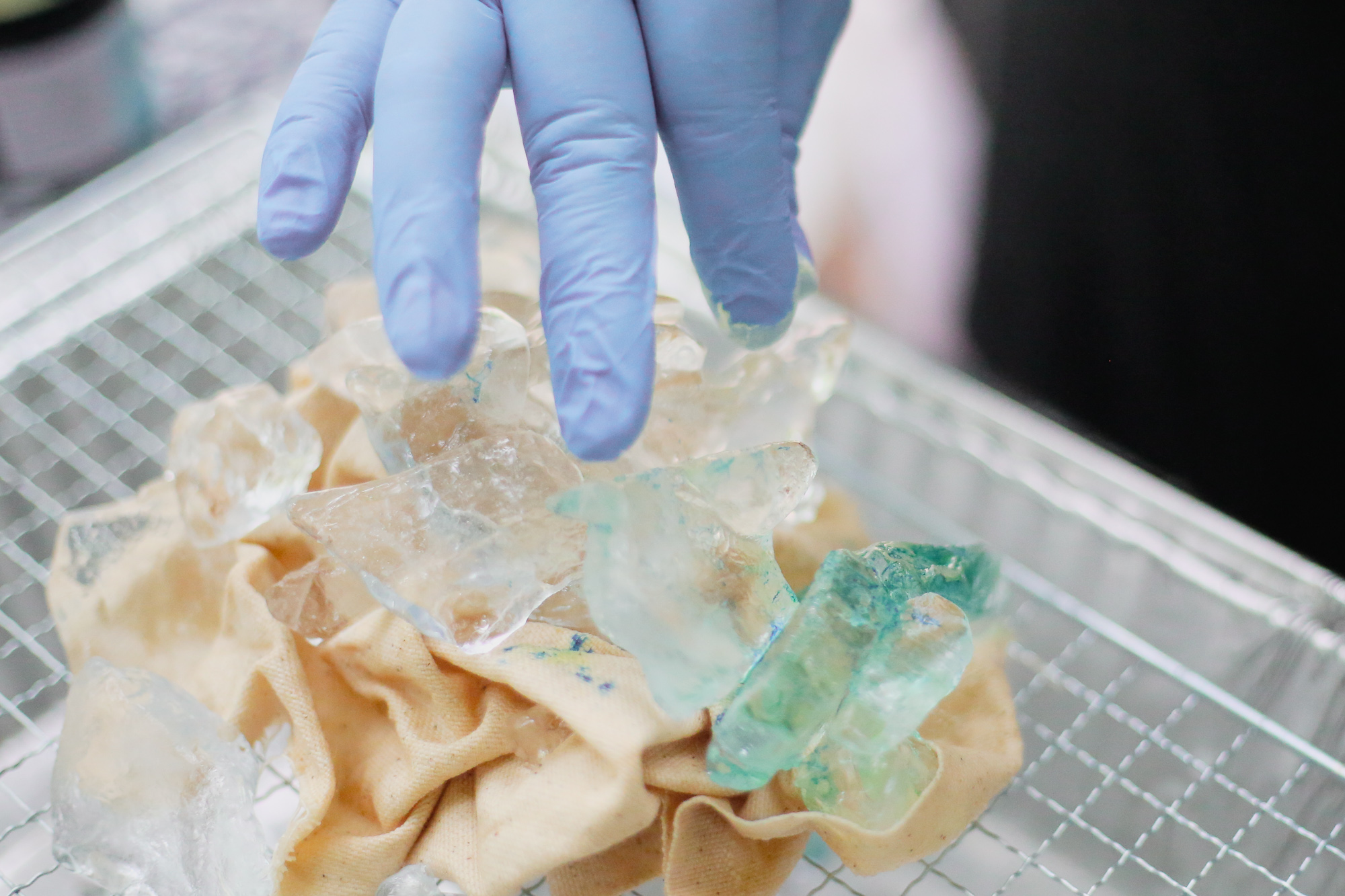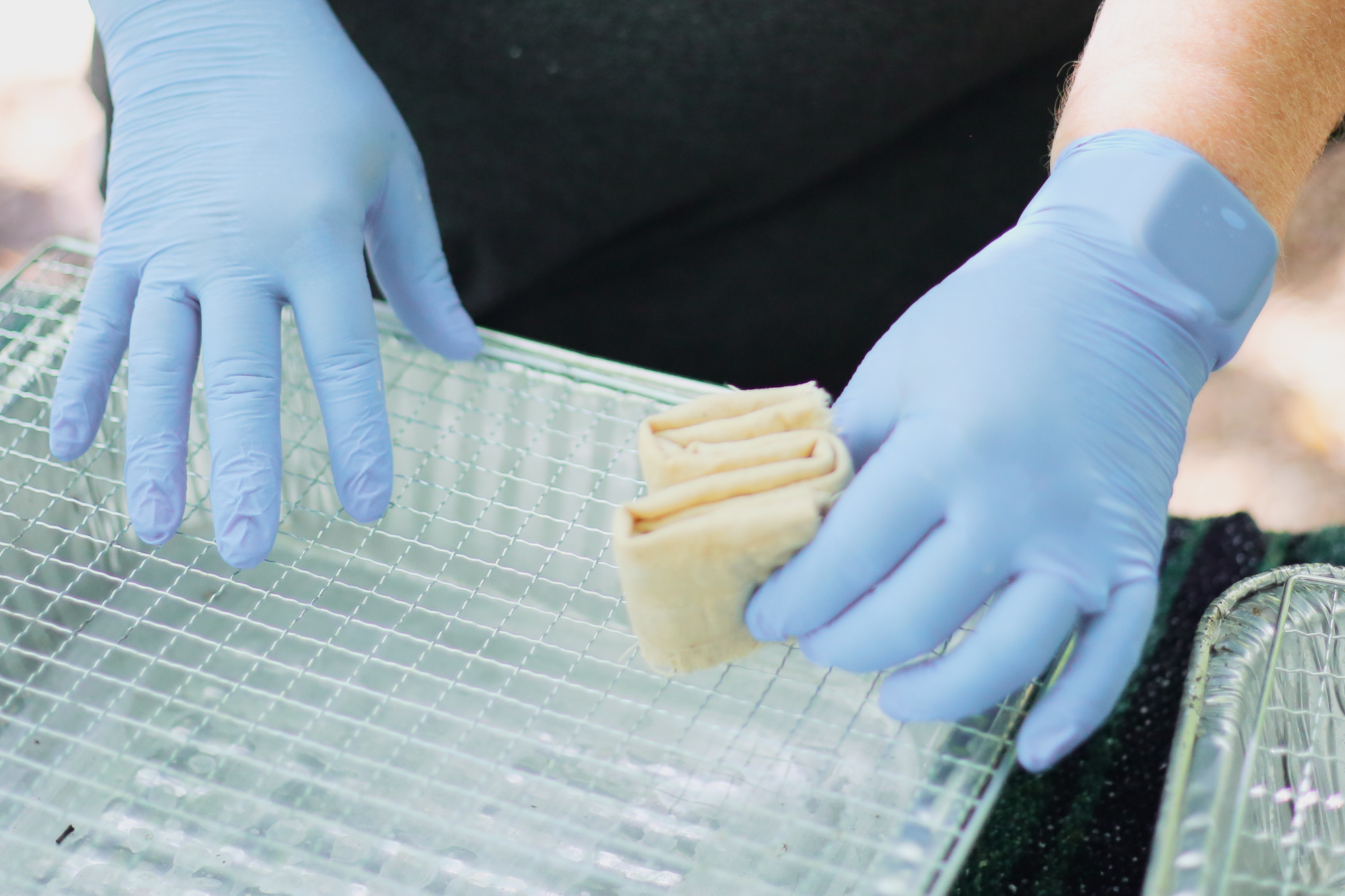 - Once your piece has rested for 24 hours, you can rinse out the dye into the sink until the water runs clear. (Wear your gloves whenever handling the color piece until it has been rinsed clean).
