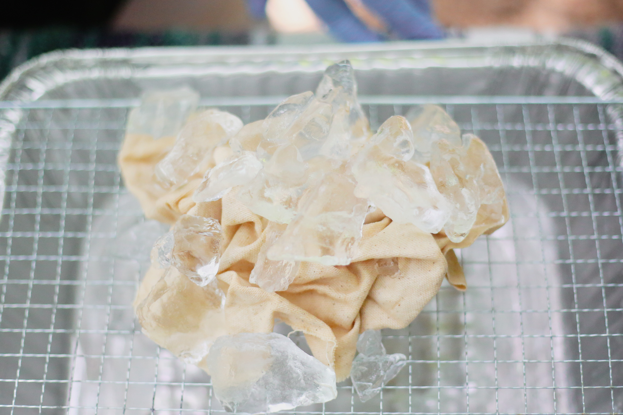 - Lay your piece on top of the wire grate (the bin will be underneath) you will want to have room in between the gate and the bin for the ice to flow through once it begins the ice melting process.Â