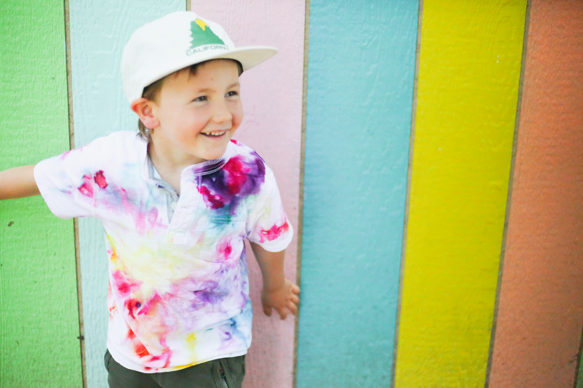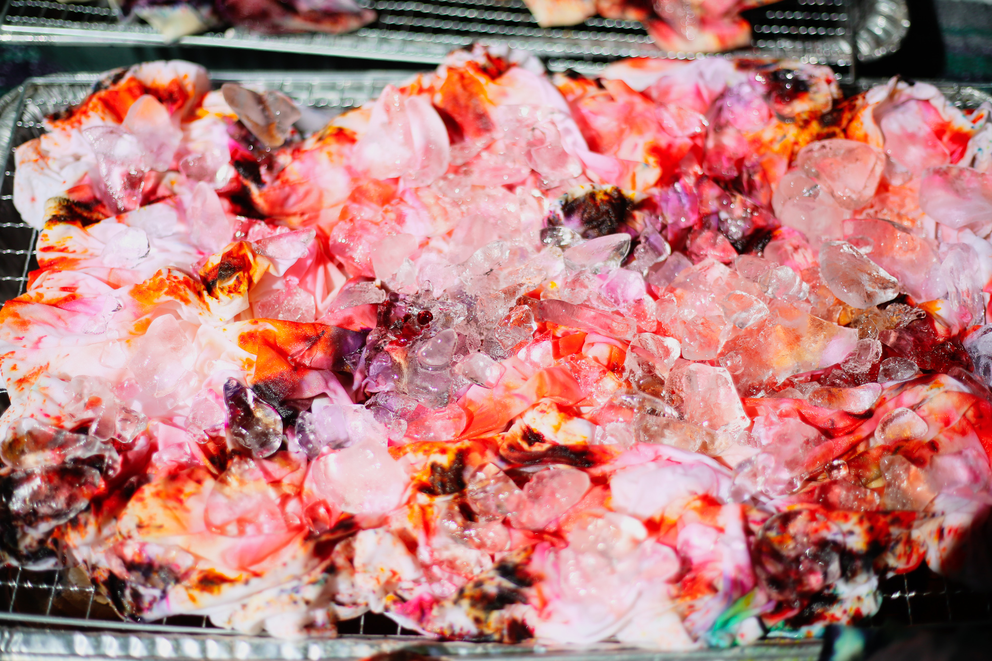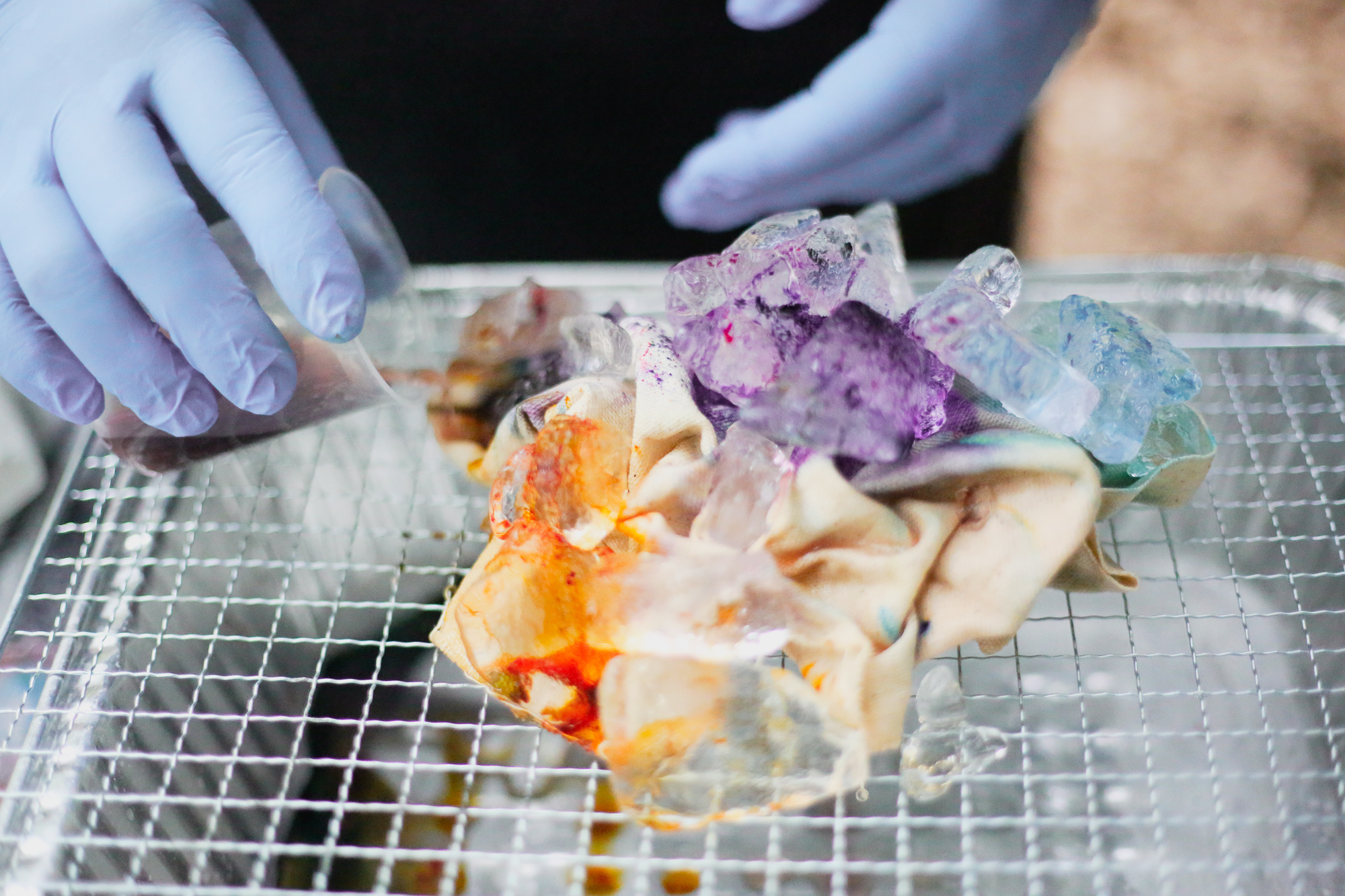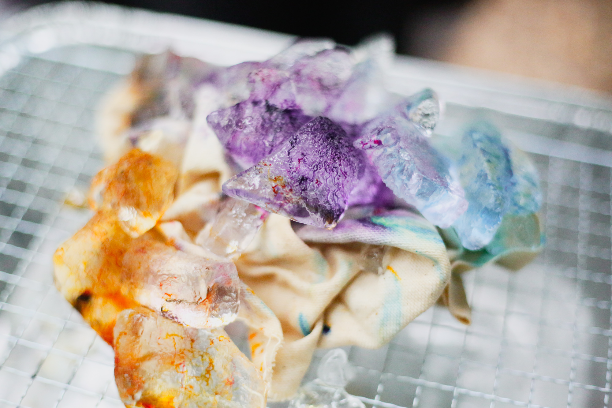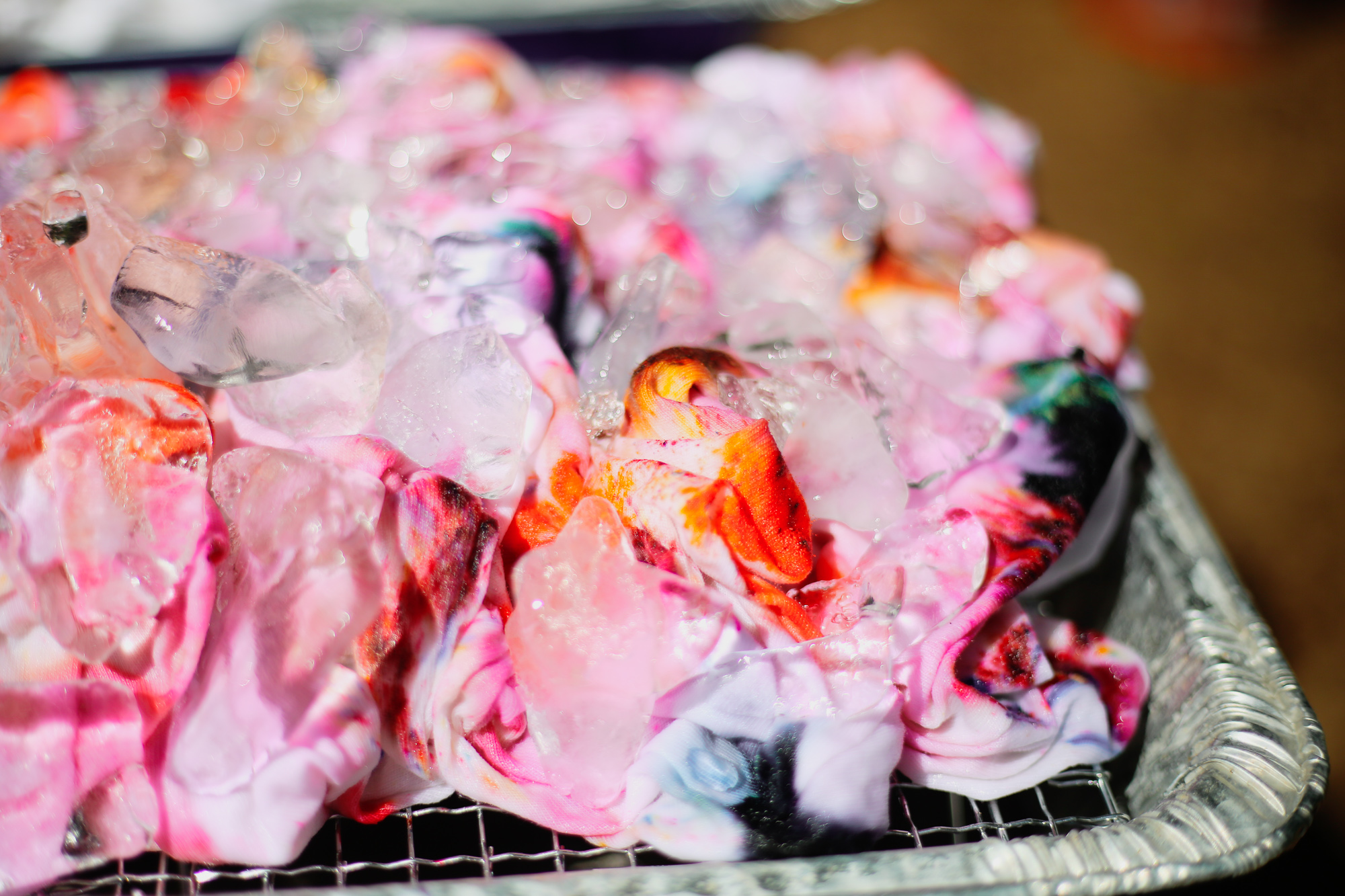 - Cover the entire piece in ice. The more ice, the more movement your colors will have. Less ice can cause “sprinkles” of the dye to remain after the dye process is complete (a great look too!) You can use any kind of ice you have on hand, experiment with different size ice cubes for different effects (don’t forget to record your experiments on your sheet).