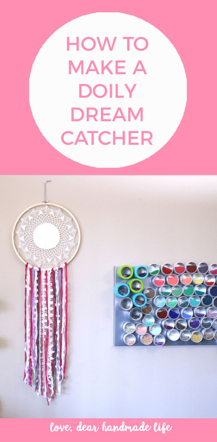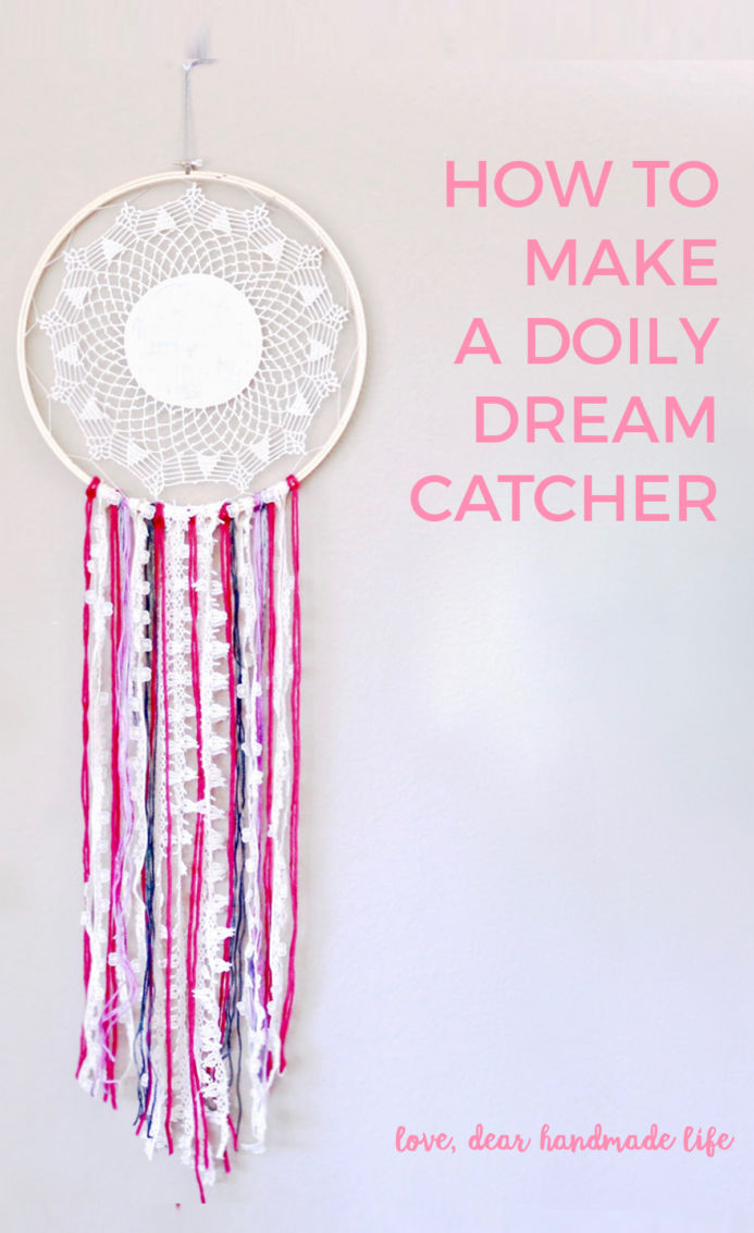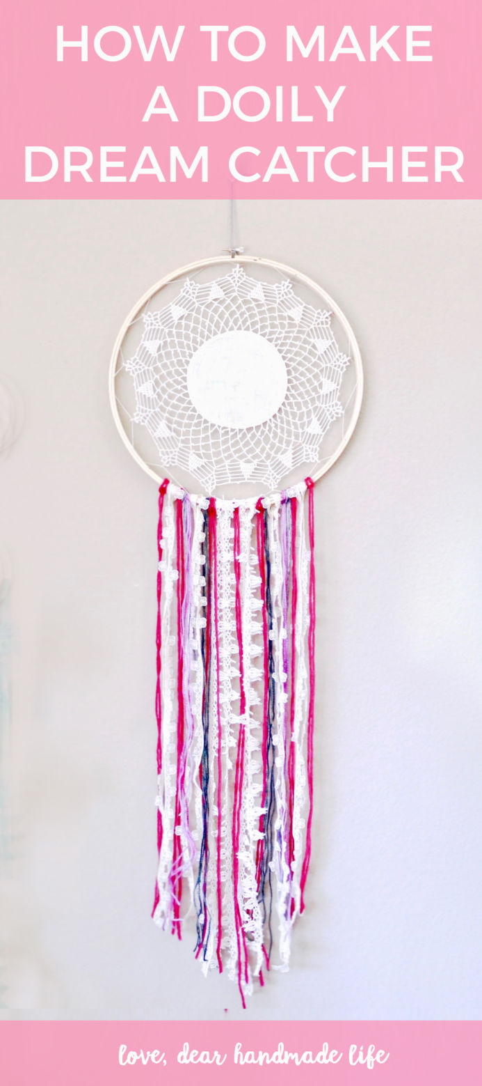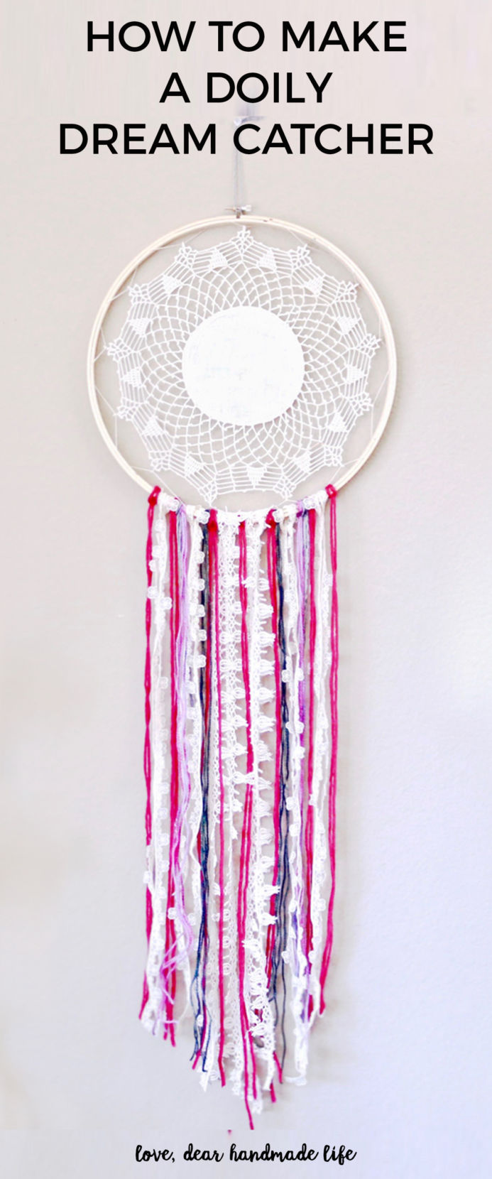Hi everyone! Joan from Break + Remake here! You’ll love this tutorial for a doily dream catcher and bonus, you’ll put it together in a snap. It was easier than I thought it would be to put it together. If you have lace doilies, grab them. If you don’t they are pretty easy to find at vintage or thrift stores. This is a choose your own adventure project as well, you can add feathers or beads to make a fancier dream catcher or keep it fairly simple. However you make it, tag @DearHandmadeLife and @BreaknRemake on Instagram so we can see your beautiful finished pieces.