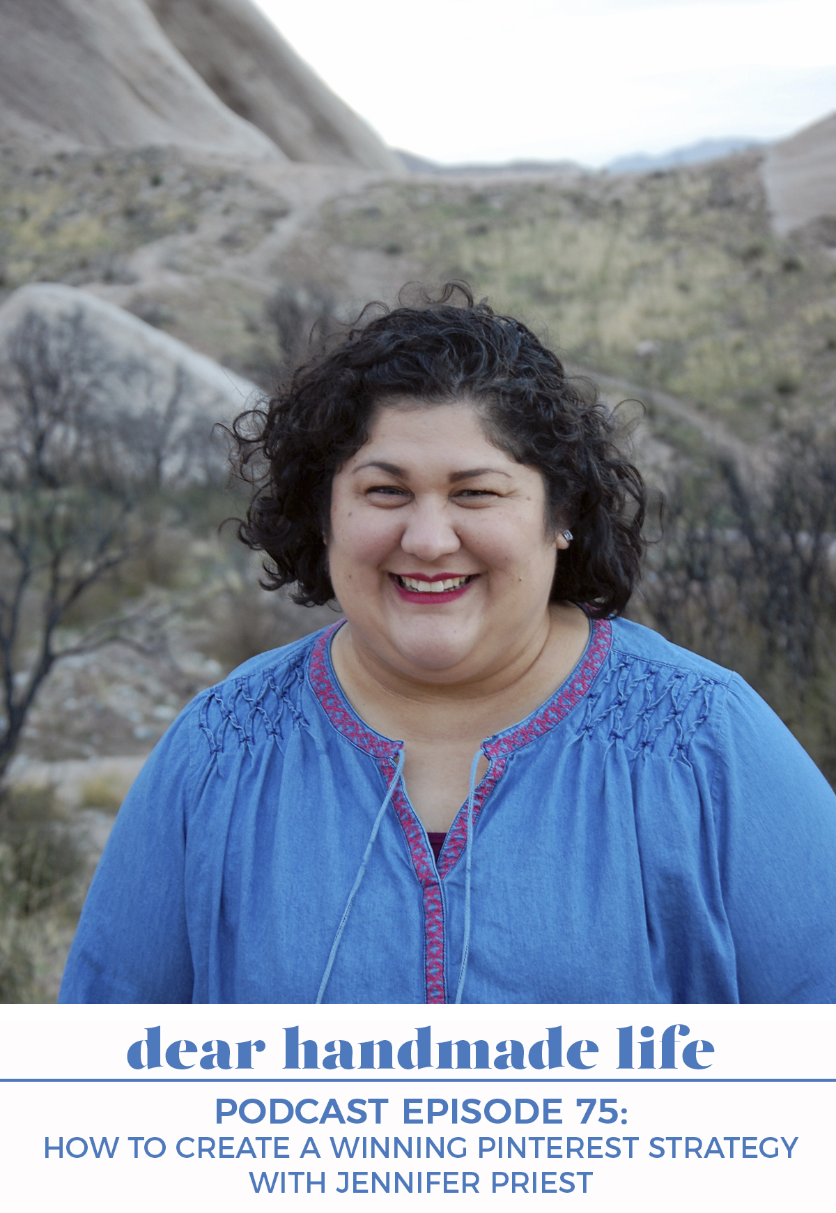 Today on the Dear Handmade Life podcast we talk with Jennifer Priest who owns digital marketing consultant brand Smart Creative Social and the blog Smart Fun DIY about creating a winning Pinterest Strategy. We chat with Jennifer about using Pinterest as a market research tool, to forecast trends and as the ultimate search engine to drive traffic to your site plus the best ways to use secret boards, the importance of solving a problem with your product or service, how to stand out from the competition, why fighting the social media algorithms is futile, optimizing your Pinterest content and more.