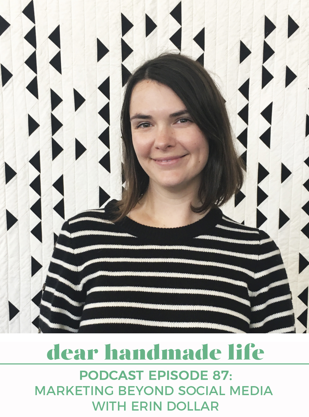 Today on the Dear Handmade Life podcast I’m talking about marketing beyond social media with Erin Dollar of Cotton & Flax. We talk about creating a well-rounded online presence emphasizing platforms you have control and ownership over and how to create unique in-person experiences at retail events like craft shows and pop-ups as well as mixers and conferences.