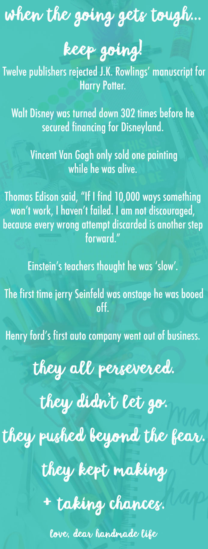 I’m going to share the big “secret” I learned pretty early on in my business and creative life. It isn’t easy. You’re going to have moments where you want to do more than throw in the towel. You’re going to want to take the towel and stomp on it and then burn it while chanting or screaming. You’re going to get intense bouts of imposter syndrome and question why you ever thought YOU had the talent to be an artist or the skills to be a business owner. Doubt and overwhelm WILL HAPPEN! They’re unavoidable. What separates the makers who are dreaming of making time for their creativity or the entrepreneurs who are wishing they had the problem of not being able to keep up with the demand for their products or services is not JUST talent (Ie: having a product or service that someone actually wants to engage with) but perseverance, working hard AND smart and adaptation.