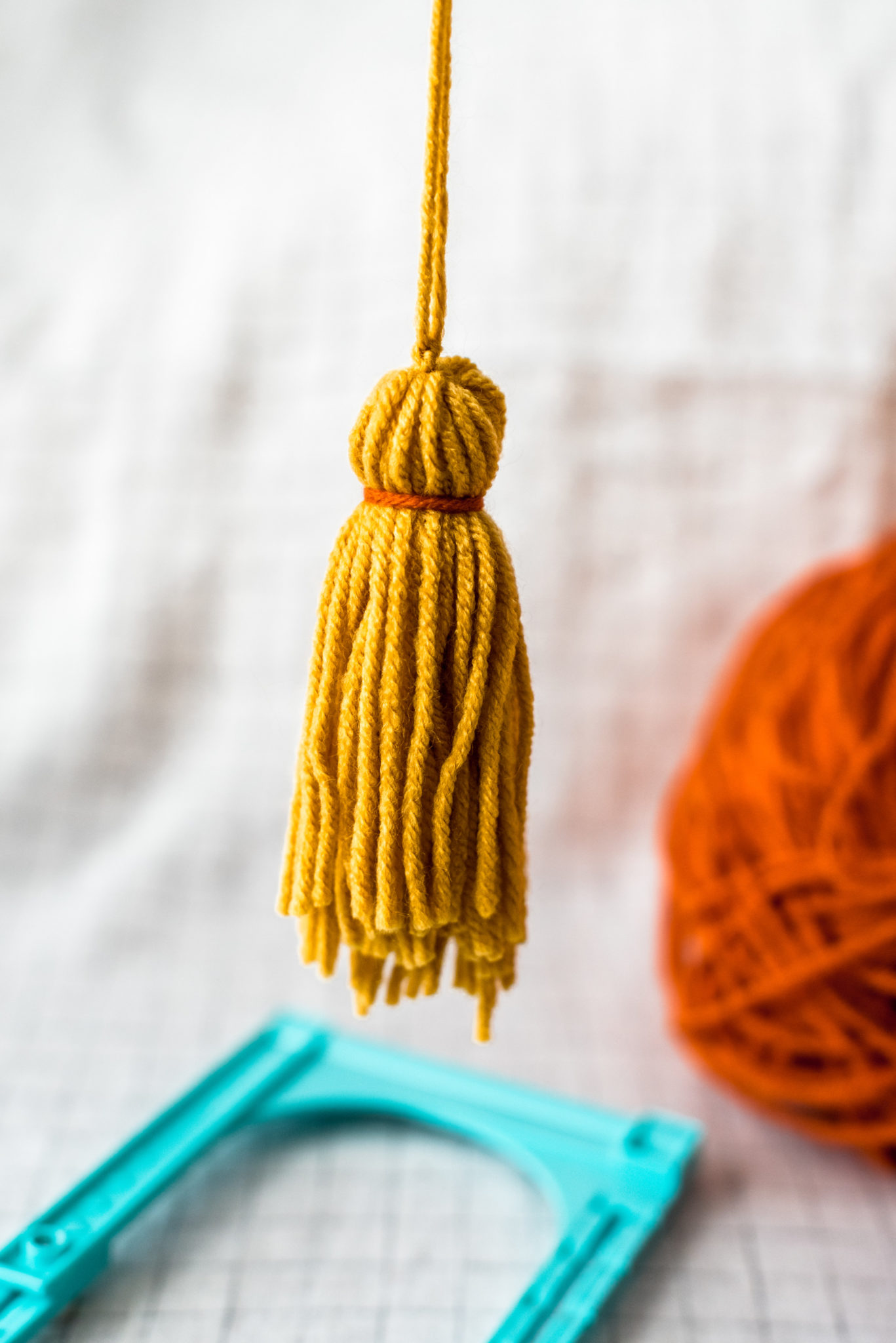 To make the “head” of the tassel, take another small length of yarn, I used different colors for this part. Lay the small length of yarn down and then lay your tassel on top of that, and tie a double knot around the tassel to create the ‘head’. You could wrap the yarn around a few times here to give it a different look, I only did it once.