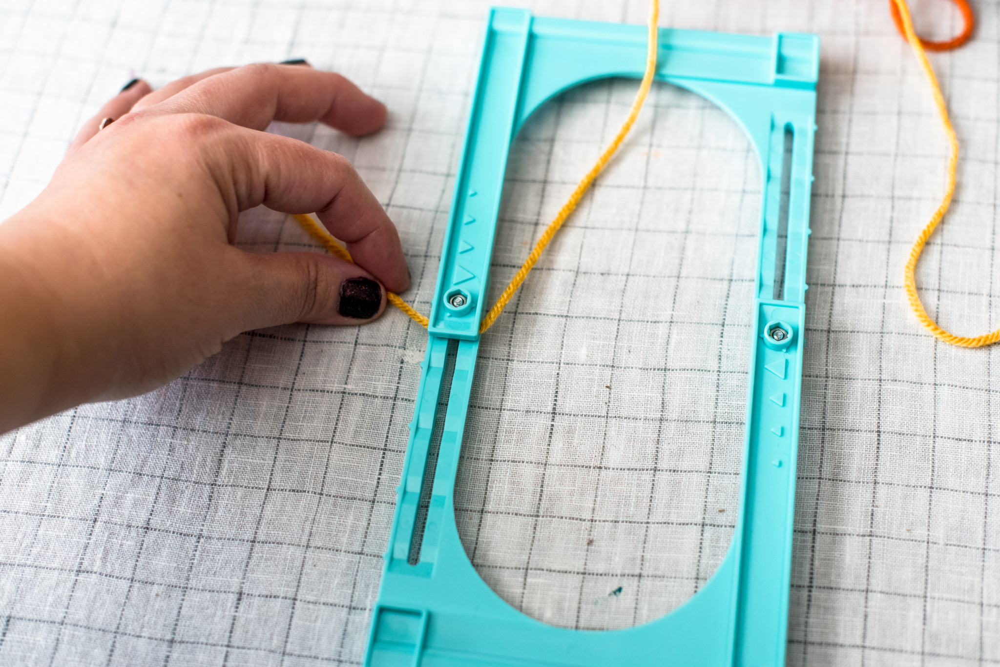 1. These Tassel Makers from Clover are what really makes this project SO quick and easy. For this project I only used the large size. The small size would be great for thinner yarn or embroidery floss to make tassels for jewelry or small embellishments. There are screws on each side of the maker that you loosen to extend the size and tighten back up, I made mine that the largest I could. Work from the “back” side of the maker, there are two little lips with arrows on them to guide you.