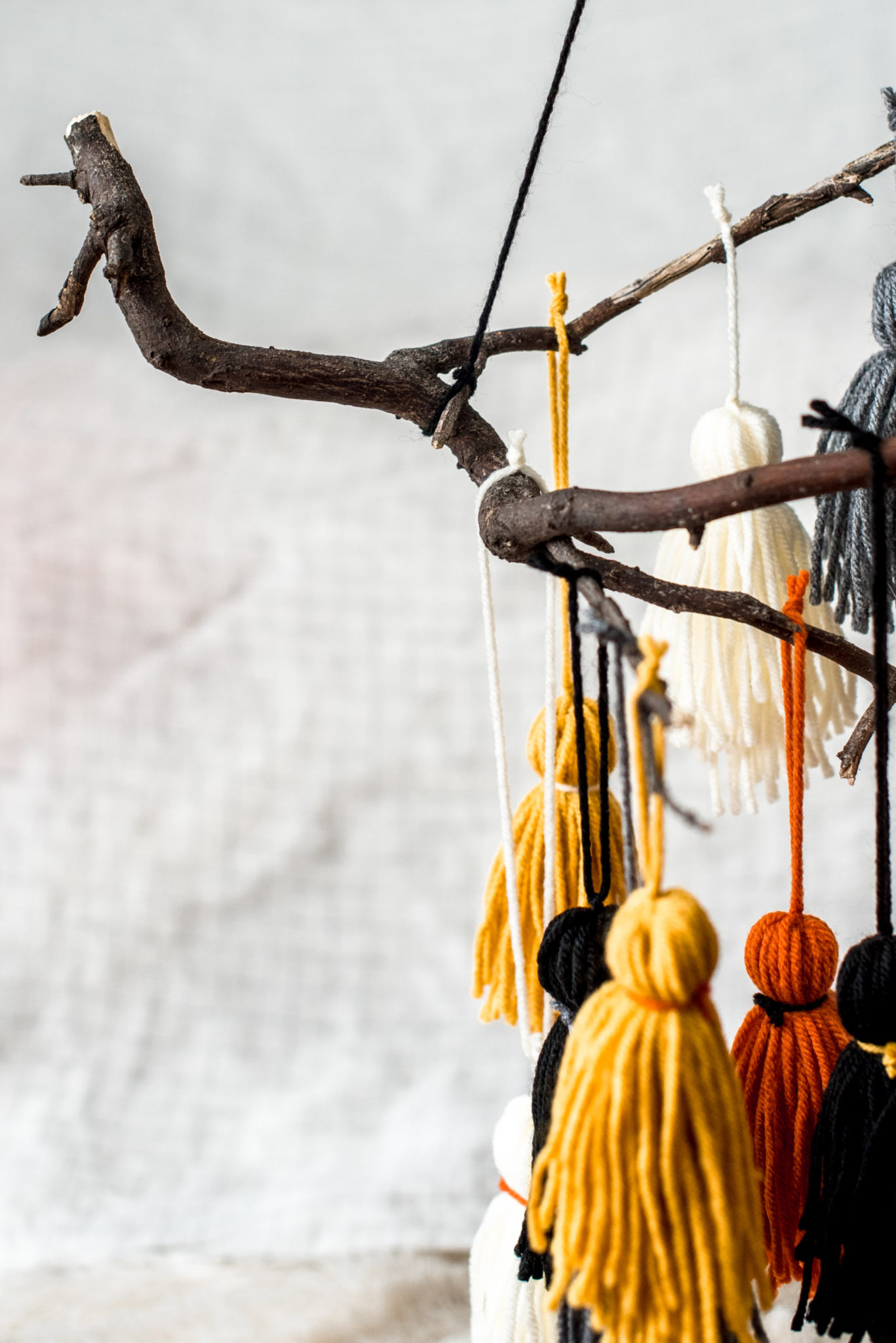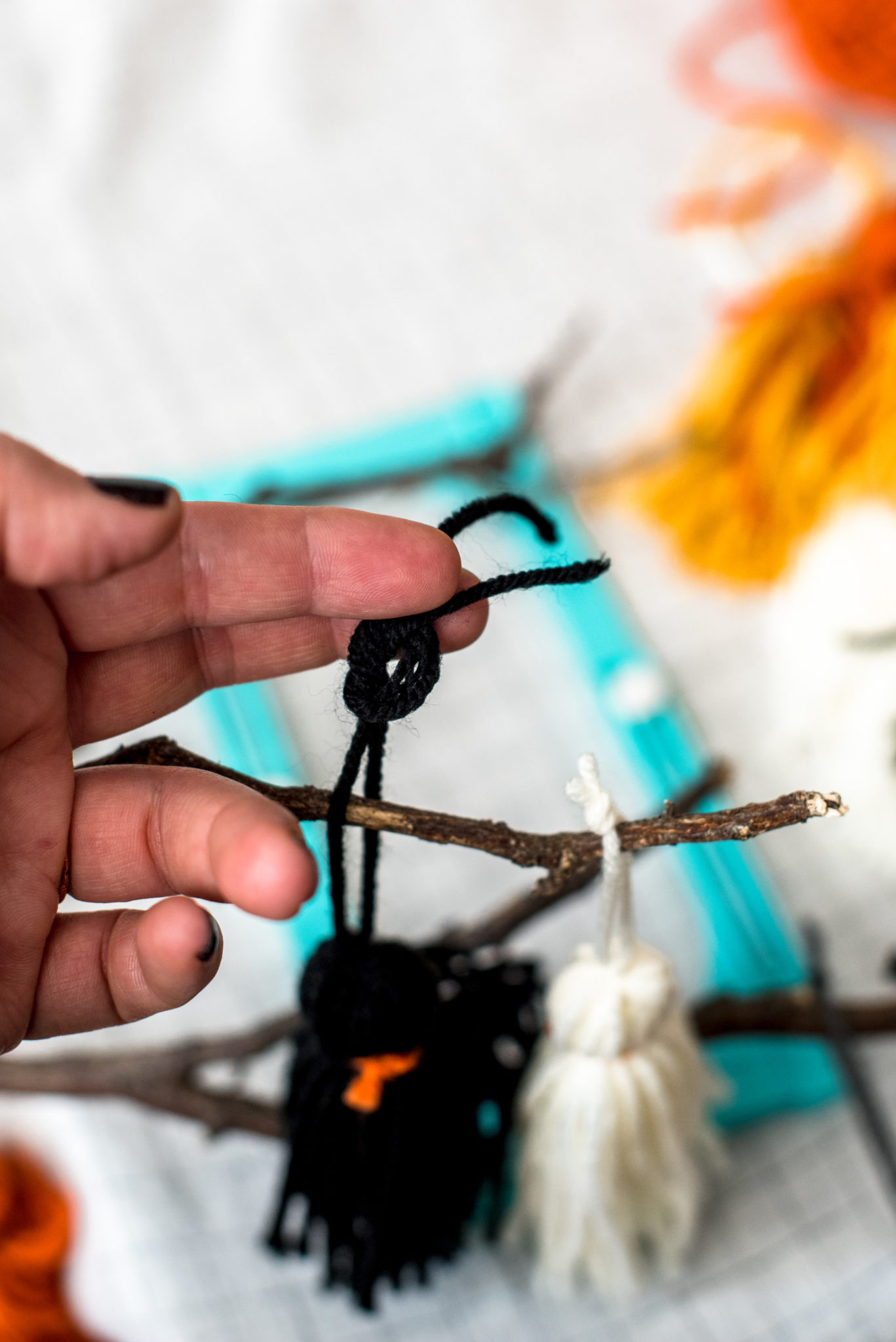 2. Tie your tassels to your tree branch/wooden dowel in whatever pattern you’d like! A special shout out to my friend Katie (@glitter_folk_studio) for finding me the PERFECT tree branch in her backyard! To tie the tassels to the branches, I just used a simple double loop knot at the top and then trimmed it. To make them longer, use a corresponding color of yarn in a longer piece and tie it to your tassel and then to the branch. For what it hangs from, I just used a long piece of black yarn and tied it on each end of my tree branch.